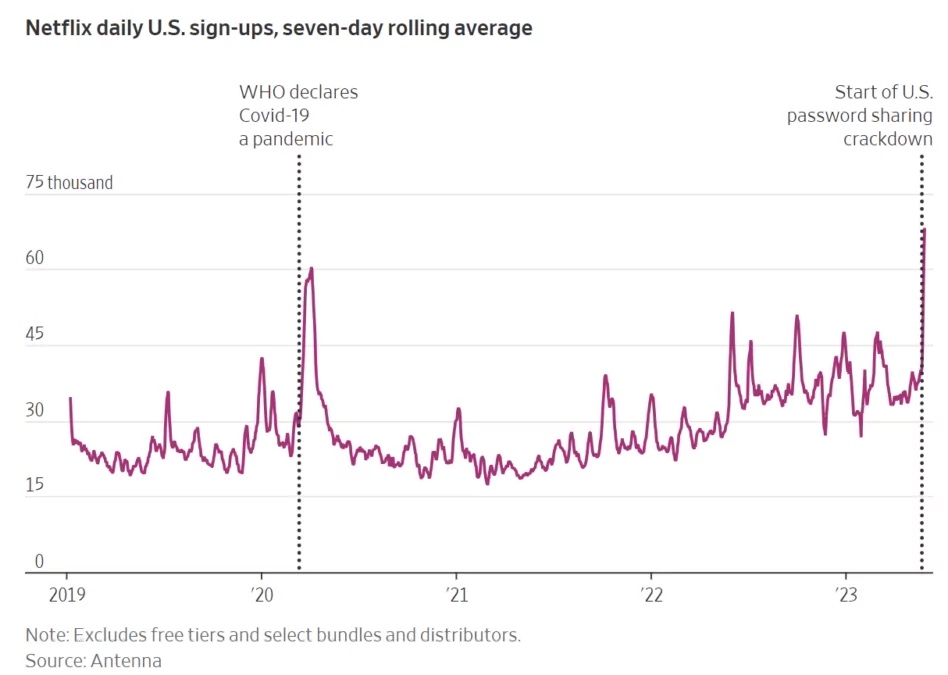 V rozmezí 25. až 28. května, tedy krátce poté, co Netflix začal uživatele ve Spojených státech informovat o nových omezeních týkajících se sdílení hesel, zaznamenala služba více nových předplatitelů než v jakémkoli jiném čtyřdenním období od roku 2019, kdy analytická společnost Antenna začala tyto údaje na trhu předplatného sledovat.