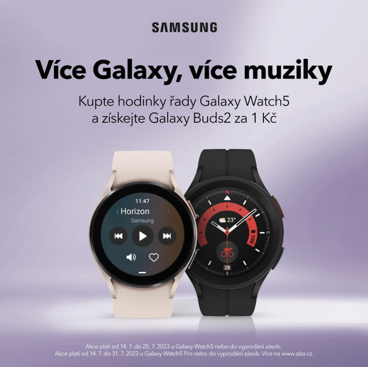 A navíc, při nákupu chytrých hodinek Galaxy Watch5 nyní získáte sluchátka Galaxy Buds2 jen za 1 Kč. Tato nabídka u Galaxy Watch5 platí od 14. 7. do 25. 7. 2023 a u Galaxy Watch5 Pro od 14. 7. do 31. 7. 2023.