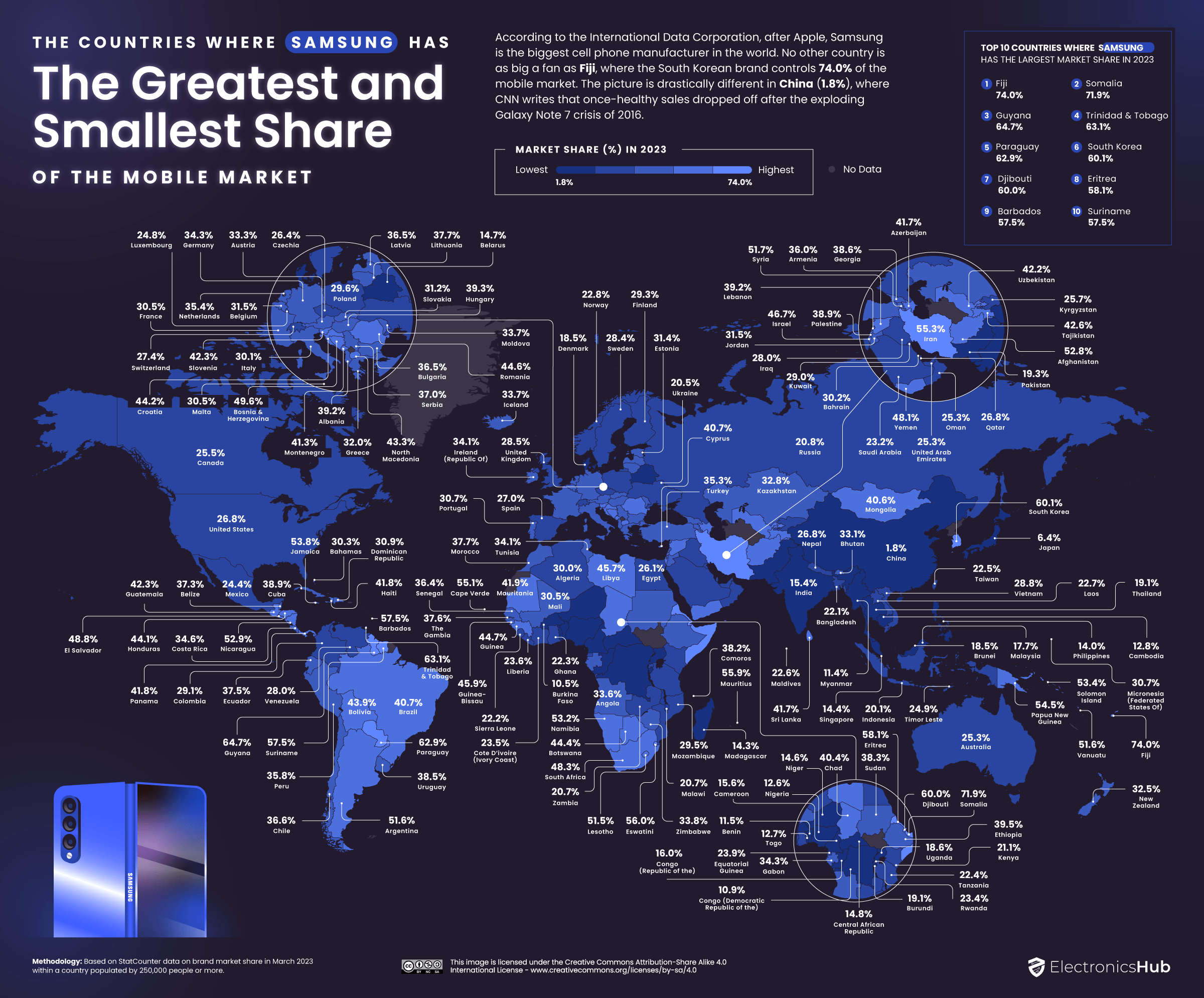 Největší náskok má Samsung na Fidži, kde jeho podíl na trhu činí neuvěřitelných 74 %, což je o 14 % více než v domovské Koreji. Dalšími zeměmi, kde jeho pozice dosahuje neskutečně vysokých čísel je Somálsko s 71,89 % a Guyana s 64,72 %. V některých státech je firma na neustálém vzestupu. Příkladem může být Litva, kde si za poslední rok přikrojila na svou stranu o 8,24 % více, k čemuž přispělo křižácké tažení země proti čínským výrobcům spojené s obavami o bezpečnost a obranu.
