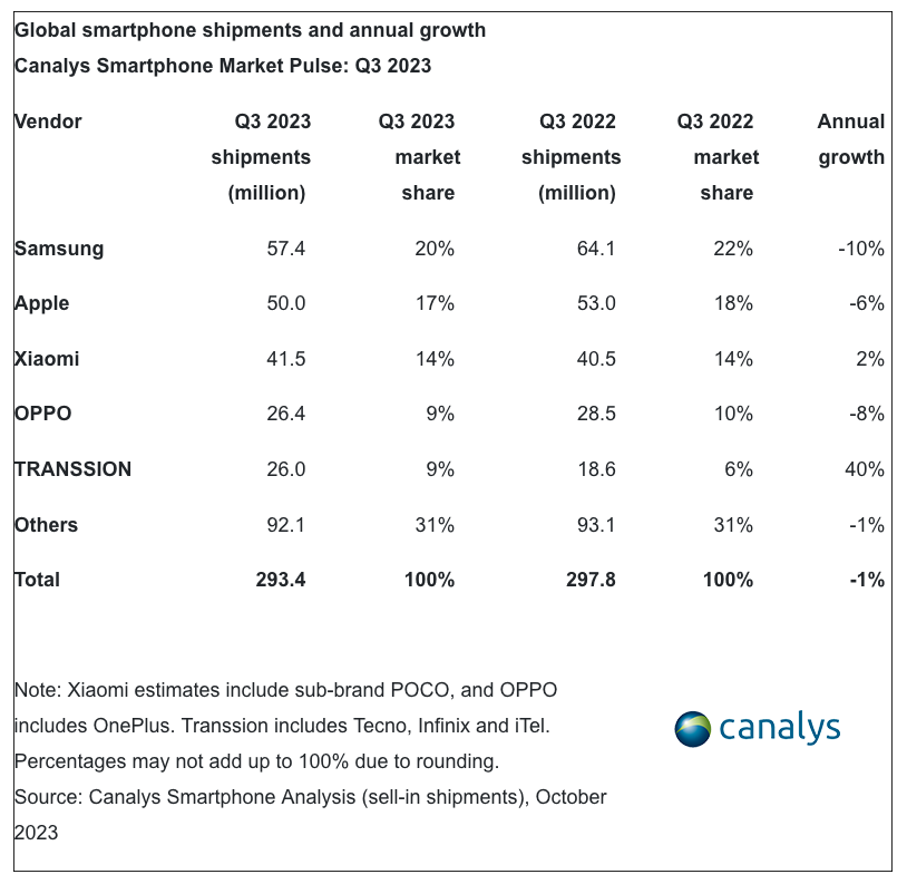 Nejnovější údaje společnosti Canalys ukazují, že v tomto čtvrtletí Samsung vede s 20% podílem na trhu, čímž překonává společnost Apple na druhém místě se 17 %. Třetí příčku obsazuje Xiaomi, včetně POCO se 14 %, čtvrtou OPPO, což zahrnuje také OnePlus, s 9 % a pátou čínský konglomerát TRANSSION (Tecno, Infinix a iTel) s 9 %. Všichni ostatní prodejci dohromady tvoří největší 31% kus koláče.