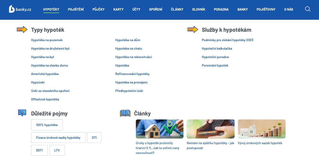 O důvod víc nahlédnout na banky.cz, jež se oblasti financování nemovitostí prostřednictvím hypotečního úvěru věnují velmi detailně. Výběrem této položky se rozbalí nabídka různých typů hypoték od té na byt, pozemek nebo stavbu domu až po americkou, úvěr ze stavebního spoření a další. K problematice hypoték portál nabízí služby hypotečního poradce, kalkulačku, možnost porovnání a zmiňuje též aktualizované podmínky pro získání hypotéky v roce 2023. To vše doplňuje ve velmi povedeném menu několik užitečných pojmů a návrhů souvisejících článků webu.