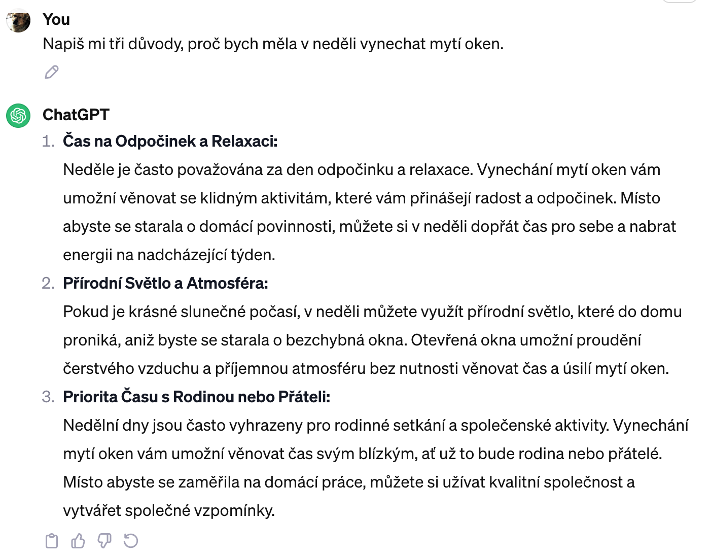 Potřebujete přeformulovat e-mail tak, aby zněl profesionálněji? Vytvořit seznam deseti důvodů, proč byste dnes doma neměli uklízet? Napsat babičce básničku k narozeninám? S psaním všeho druhu vám hravě pomůže ChatGPT, a to samozřejmě i v češtině. Jen je potřeba si zkontrolovat pravopis, gramatiku a slovosled.