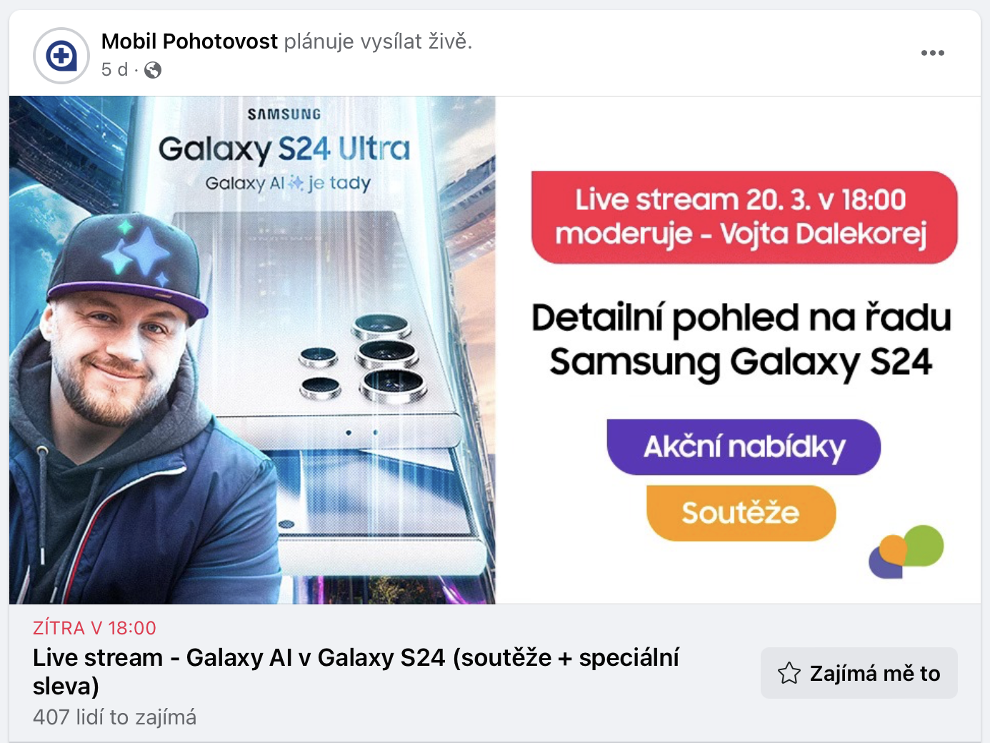 Chcete vyhrát Galaxy Buds FE, mít možnost koupit Galaxy S24 absolutně nejvýhodněji nebo dokonce vyhrát obměnu svého starého telefonu za nový Galaxy S24 zcela zdarma? Pak se určitě připojte na speciální live stream, který proběhne už dnes 20. 3. od 18:00 na Facebooku Mobil Pohotovosti. Ukážeme vám, co vše umí Galaxy AI v nové vlajkovce od Samsungu.