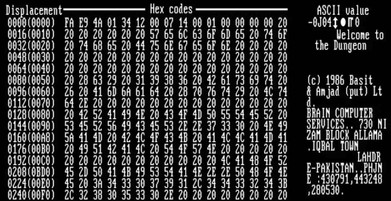 Ačkoli před ním vznikly viry ANIMAL, Wabbit a Elk Cloner, mnozí považují Brain za jeden z prvních počítačových virů, a to zejména kvůli škodám způsobeným jeho samoreplikující se povahou. Zajímavé je, že za jeho vytvořením nebyl původně žádný zlý úmysl. Když si bratři Amjad a Basit Farooq Alviovi uvědomili, že lidé pirátsky kopírují jejich lékařský software, vytvořili virus Brain, aby zabránili dalšímu porušování autorských práv. Protože Brain měl uživatele od pirátství jejich softwaru spíše odradit, než jim způsobit škodu, bratři do kódu viru dokonce zahrnuli zprávu obsahující jejich adresu a telefonní číslo.