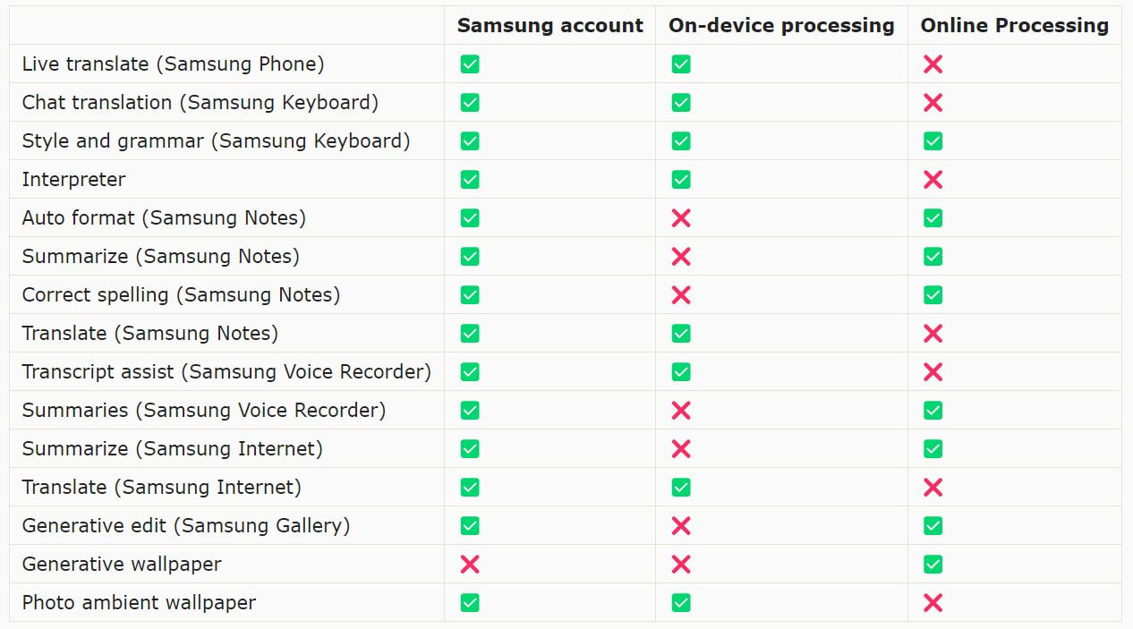Balíček funkcí Galaxy AI obsahuje mnoho funkcí, mezi které patří Circle to Search, živý překlad, asistent poznámek, chatování nebo fotografování atd. Na oficiální stránce Galaxy AI však Samsung v sekci smluvních podmínek zmiňuje: „Funkce Galaxy AI budou na podporovaných zařízeních Samsung Galaxy poskytovány zdarma do konce roku 2025. Pro funkce umělé inteligence poskytované třetími stranami mohou platit jiné podmínky.“