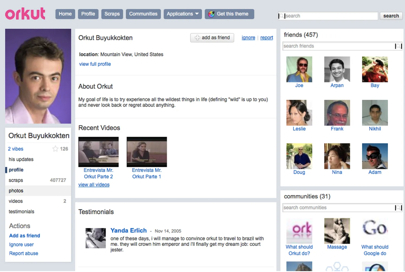 Orkut byl naopak sociální sítí od Googlu s nejdelší historií. Fungoval podobně jako tehdejší MySpace a Facebook. Uživatelé si mohli vytvořit profil, přidávat fotky, statusy a Scrapbook (něco jako nástěnku). Orkut zaznamenal úspěch hlavně v Brazílii a Indii, ale v celosvětovém měřítku nedokázal konkurovat Facebooku a dalším platformám. Nakonec ho Google v roce 2014 zavřel.