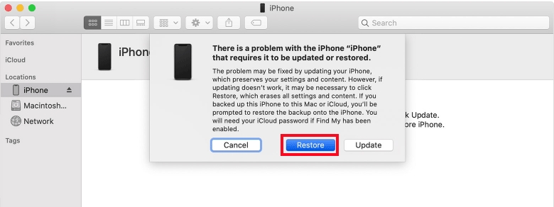 Step 3. Locate your iPhone in iTunes or Finder, then click „Restore“ option in the pop-up window to restore your iPhone and remove the passcode.