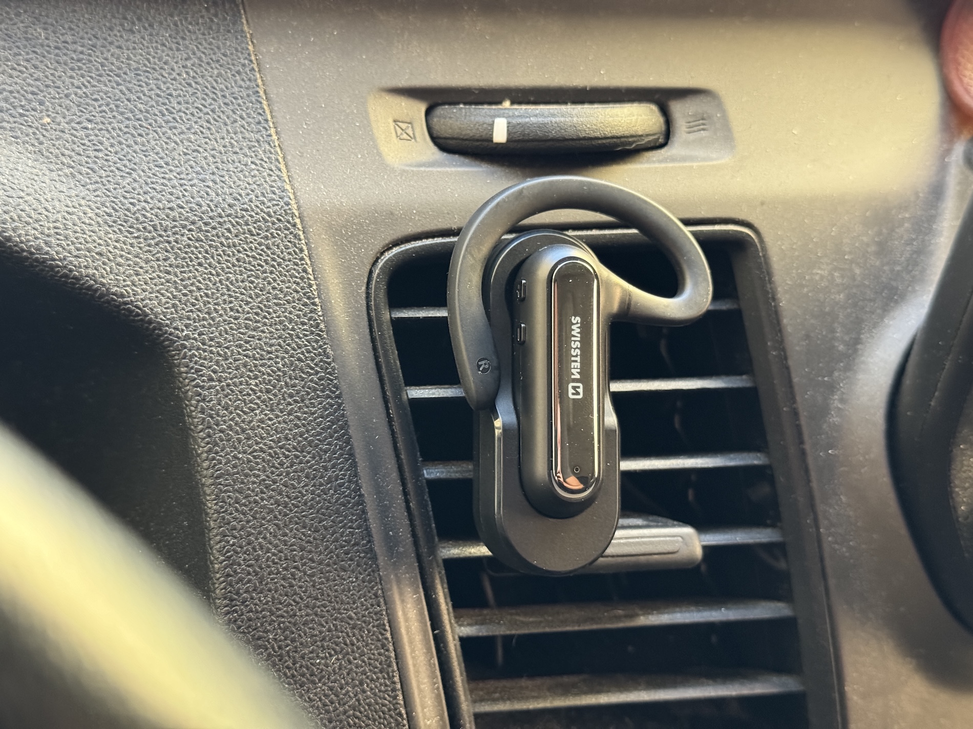 Swissten Bluetooth Headset Dock Earpiece je zařízení samozřejmě primárně určeno pro řidiče. Ti jej využijí i pokud nechtějí obtěžovat spolujezdce tím, co říká druhá strana, kterou tedy neslyší skrze klasické integrované hlasité handsfree. Proto v balení také najdete dock, který můžete umístit do mřížky ventilátoru, přičemž tak budete vždy vědět, kde sluchátko máte, pokud to není zrovna ve vašem uchu. Přítomna je i 3M podložka k uchycení třeba na palubní desku auta atd.