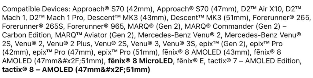 Únik o technologii displeje pochází z webu Gadgets & Wearables, který zveřejnil snímek obrazovky se seznamem kompatibilních zařízení pro vývojáře, kteří chtějí vytvářet nové ciferníky pro hodinky Garmin (viz níže). Tento seznam obsahuje všechny nejnovější modely s AMOLED displejem, zmiňuje ale i novinku Garmin fēnix 8 MicroLED a dokonce ještě jednu dosud nepředstavenou novinku, a to Garmin Tactix 8 AMOLED, kdy budou tyto hodinky dodávány ve velikostech pouzdra 47 mm a 51 mm.
