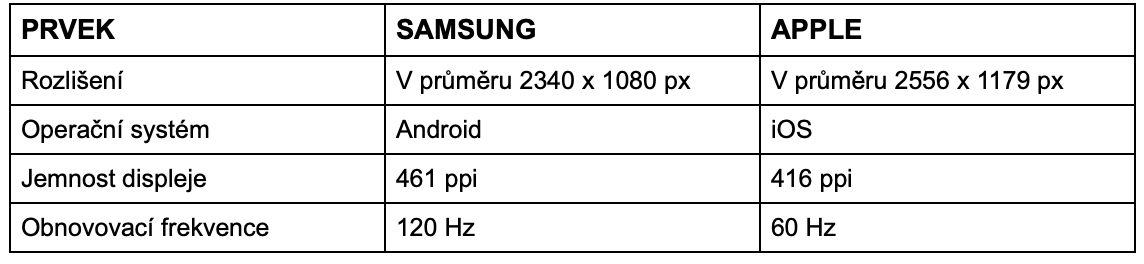Zpravidla však platí, že pokud uživatel preferuje velké displeje, více jej potěší porovnání telefonů Samsung, které mají nově dokonce displeje také sklápěcí, inspirované klasickou érou mobilních telefonů z počátku tisíciletí. Poskytují tak více prostoru pro sledování filmů, hraní her nebo práci. Apple však nezaostává za kvalitou. Mezi důležité parametry spadají: