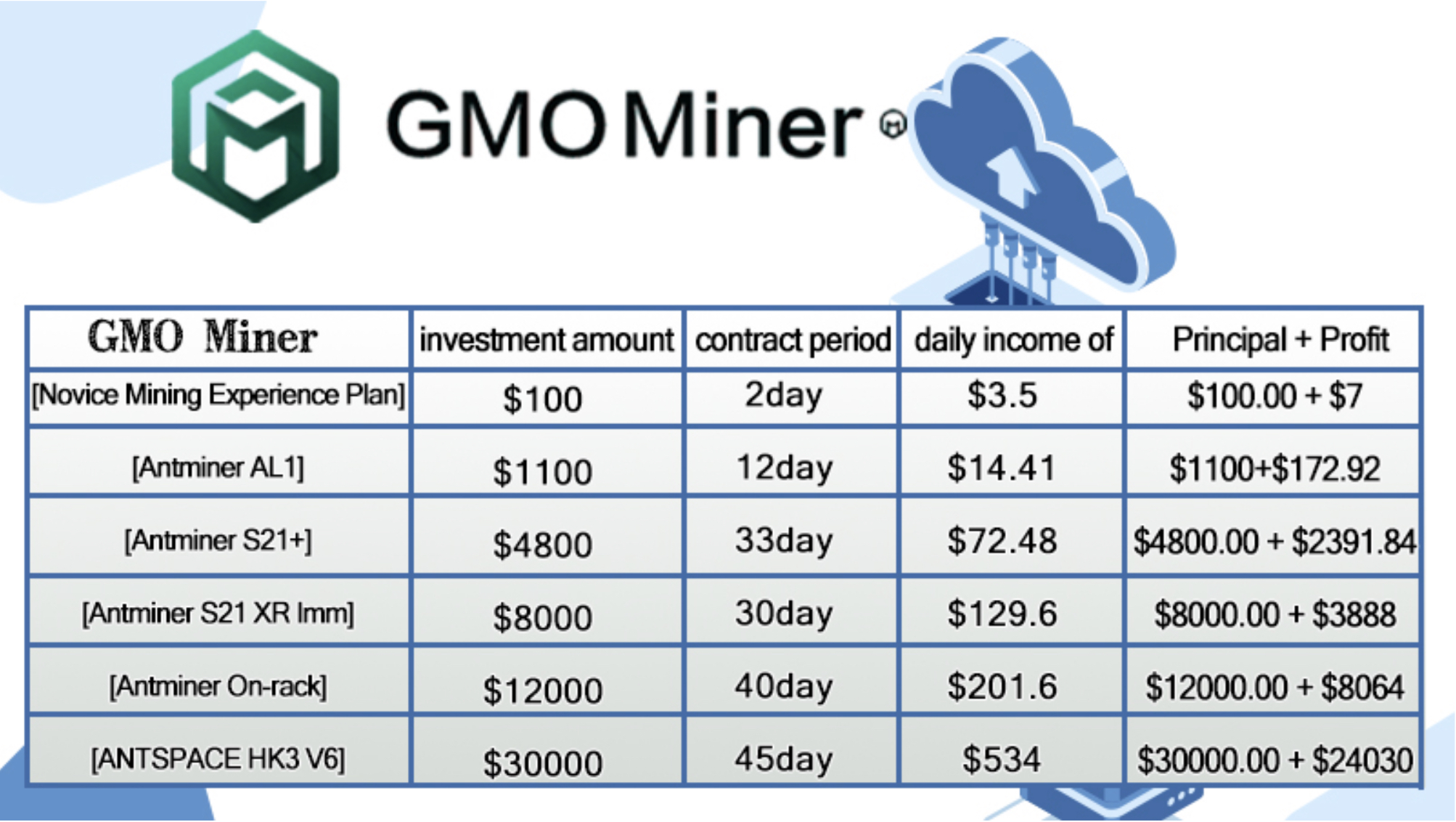 GMO Miner je technologická platforma zaměřená na cloudové těžební služby kryptoměn. Byla legálně založena ve Velké Británii v roce 2020. Platforma se spoléhá na globální výpočetní zdroje, inteligentní těžební algoritmy a bezpečné a kompatibilní obchodní systémy, aby uživatelům poskytovala stabilní a efektivní příjem z těžby. Jejím principem služeb je „umožnit každému jednoduše se podílet na bohatství, které nabízí éra blockchainu“.