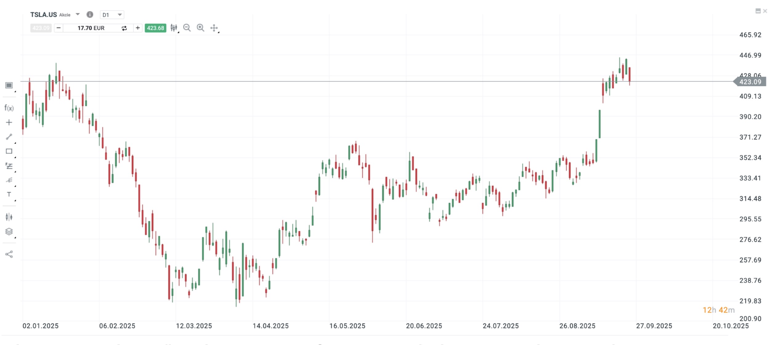 Vývoj ceny akcií společností Tesla. Zdroj: xStation. Minulá výkonnost není spolehlivým ukazatelem budoucí výkonnosti.