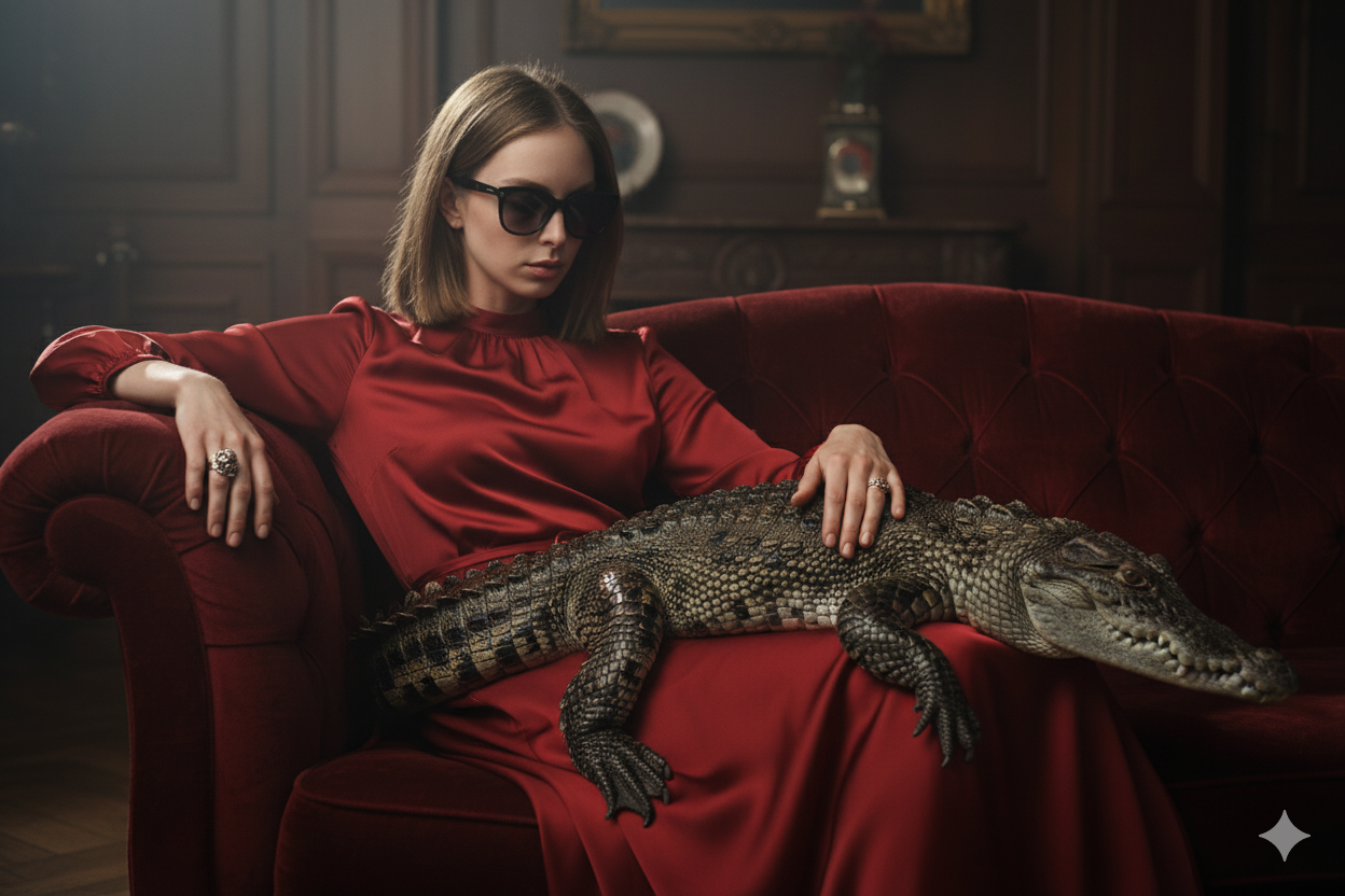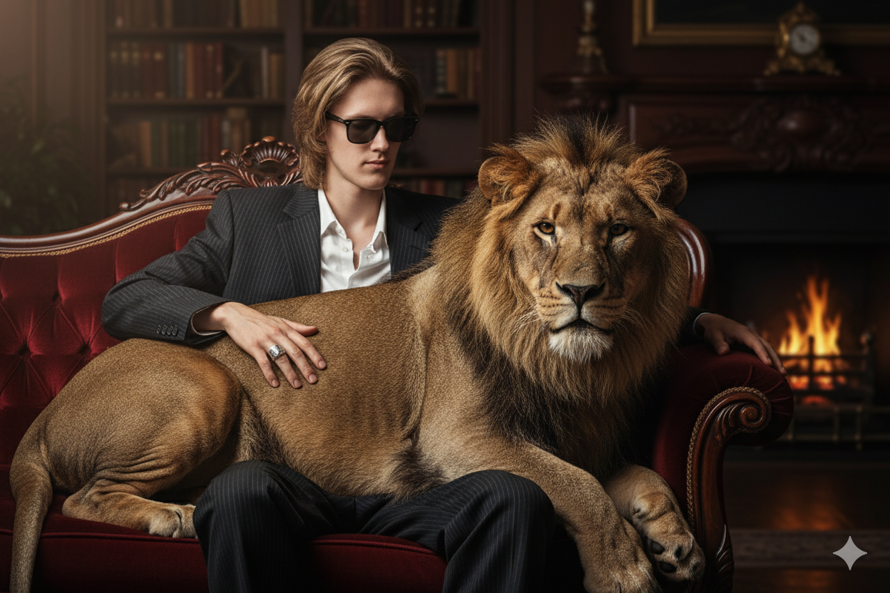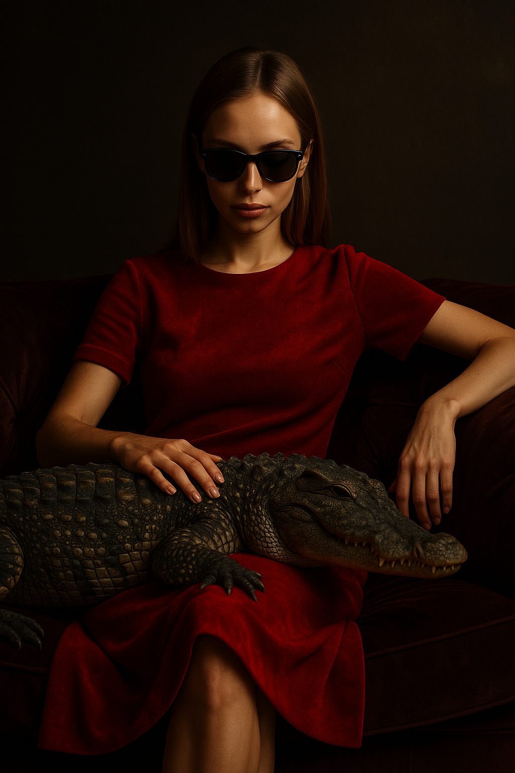 • Create a hyper-realistic cinematic portrait of the uploaded MAN. Use precise ID locking to preserve his precise facial features, hairstyle, skin tone, body proportions, age, and expressions with 100% accuracy. He exudes the personality of a powerful and domineering gangster, sitting confidently on a luxurious velvet sofa, leaning back in a comfortable yet dominant posture. A large crocodile rests on his lap, its body flowing naturally and comfortably above it. The man’s head tilted slightly downward, looking at the lion with a calm and serene expression, while dark sunglasses enhance his aura of dominance and elegance. One hand rests casually on the lion’s back, the other on the sofa’s armrest. He wears a dark, lion outfit: either a finely pinstriped suit or an open-necked silk shirt… an aura of calm and authority, his presence radiating a quiet, non-aggressive power. Style: realistic, cinematic lighting, extreme detail, and a luxurious atmosphere.