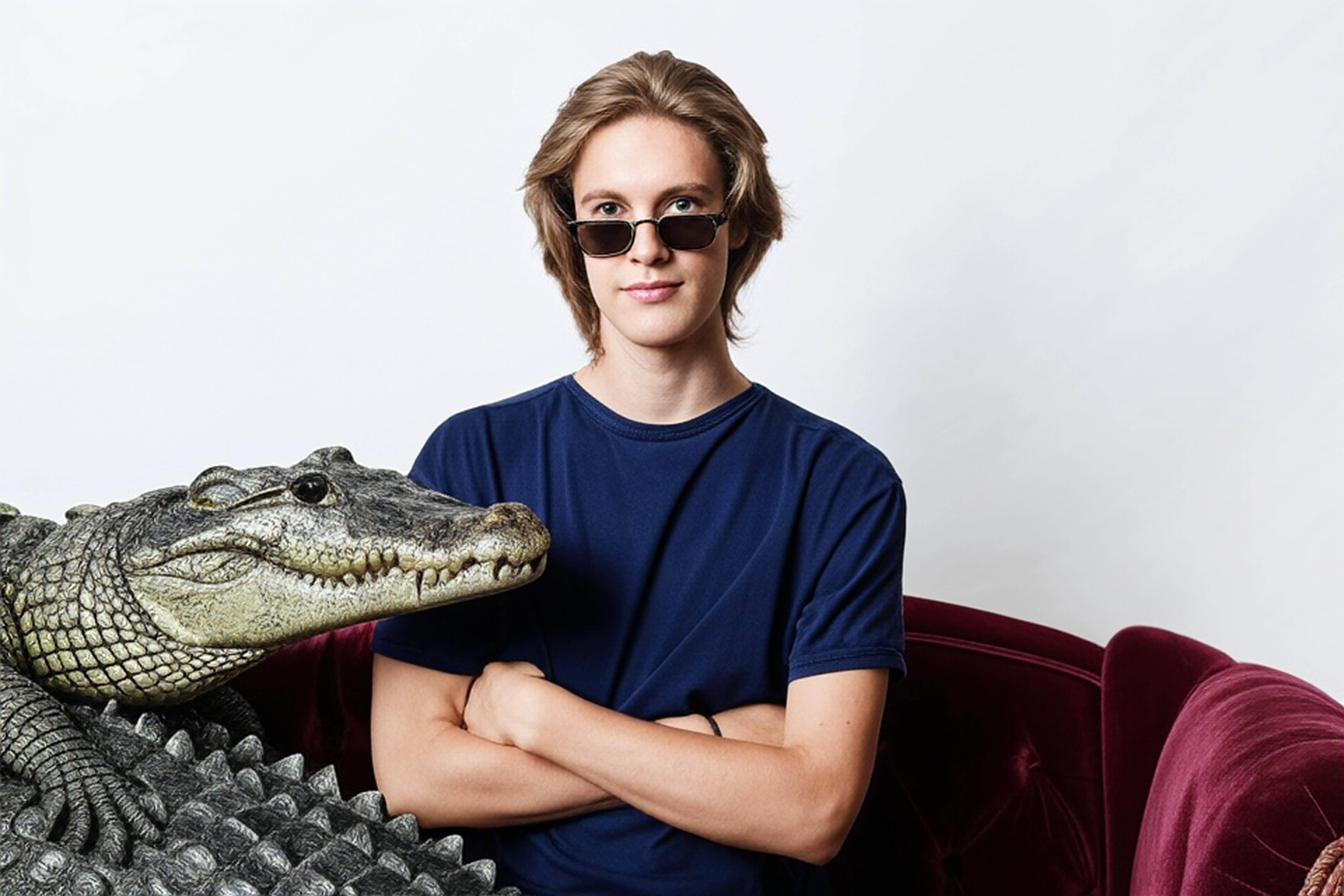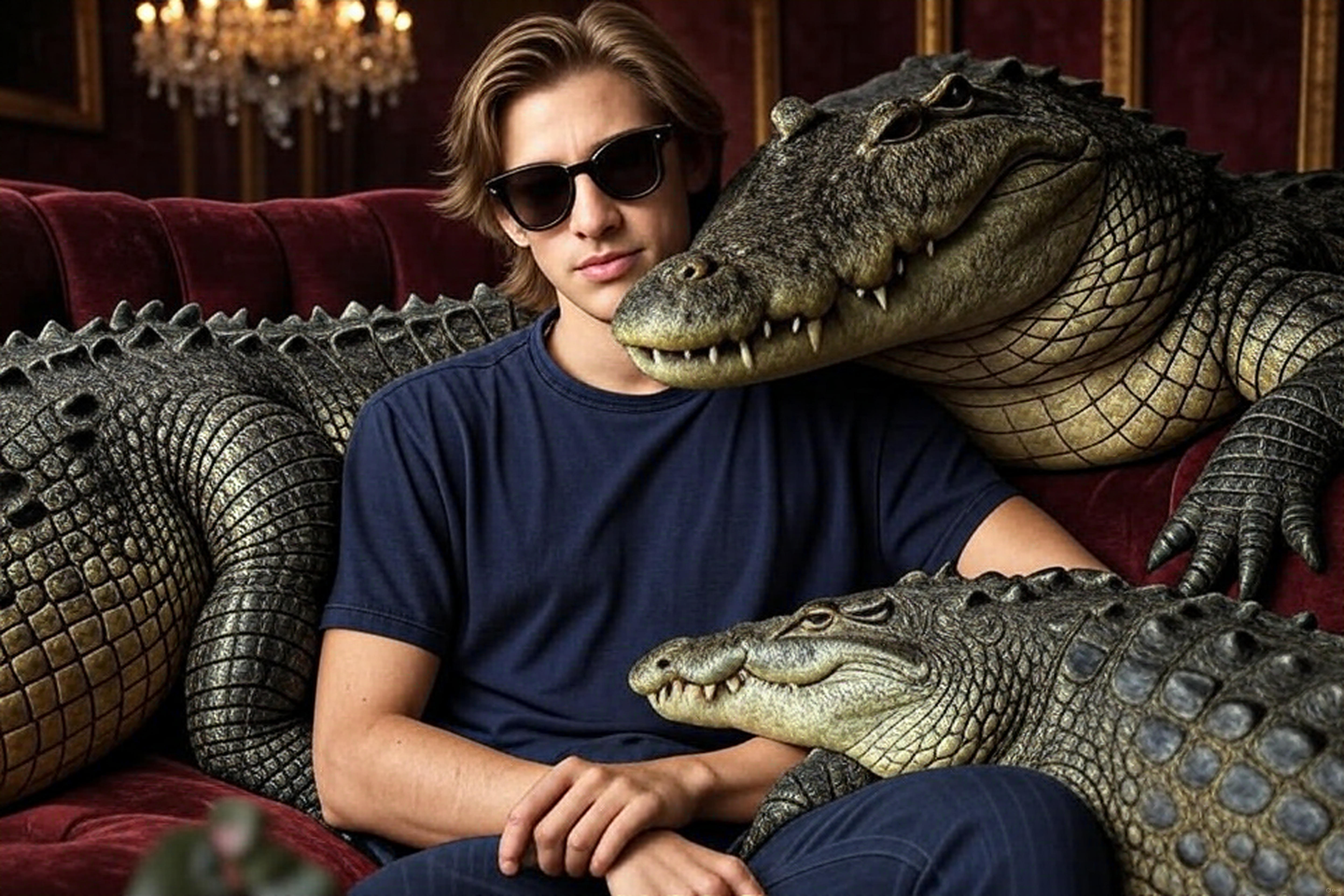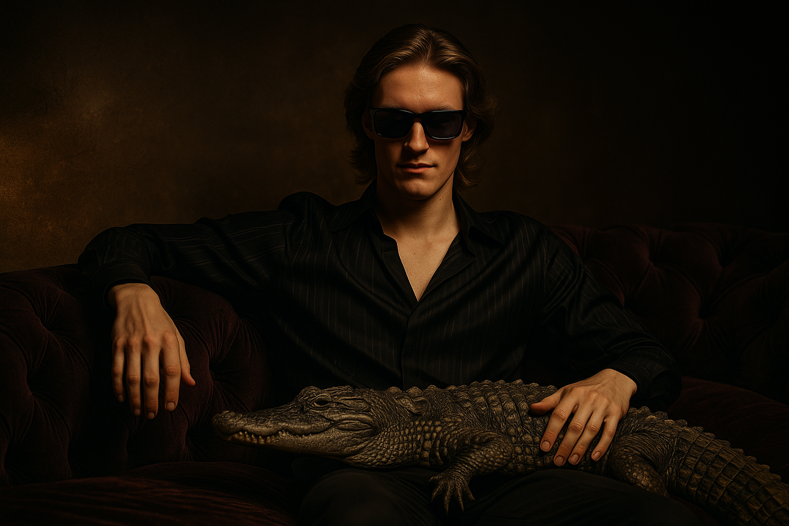 • Create a hyper-realistic cinematic portrait of the uploaded MAN. Use precise ID locking to preserve his precise facial features, hairstyle, skin tone, body proportions, age, and expressions with 100% accuracy. He exudes the personality of a powerful and domineering gangster, sitting confidently on a luxurious velvet sofa, leaning back in a comfortable yet dominant posture. A large crocodile rests on his lap, its body flowing naturally and comfortably above it. The man’s head tilted slightly downward, looking at the lion with a calm and serene expression, while dark sunglasses enhance his aura of dominance and elegance. One hand rests casually on the lion’s back, the other on the sofa’s armrest. He wears a dark, lion outfit: either a finely pinstriped suit or an open-necked silk shirt… an aura of calm and authority, his presence radiating a quiet, non-aggressive power. Style: realistic, cinematic lighting, extreme detail, and a luxurious atmosphere.