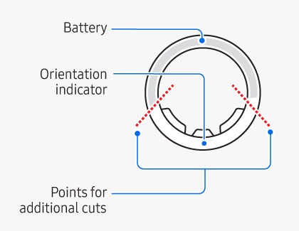 - Pokud prsten ani po odříznutí nemůžete sundat, proveďte další řez jeden centimetr vlevo nebo vpravo od orientačního indikátoru a buďte velmi opatrní, abyste se vyhnuli baterii.