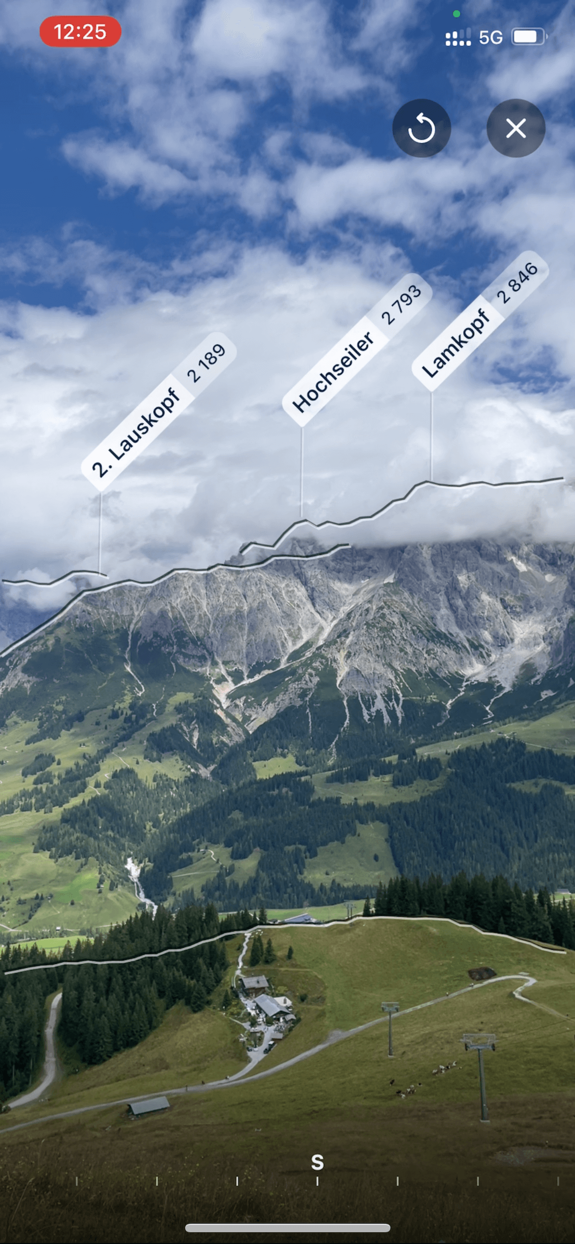U každého z identifikovaných vrcholů vidíte jeho název a nadmořskou výšku. Ve spodní části obrazovky je viditelná průhledná lišta s písmennými zkratkami světových stran (např. S, SV, JZ) k lepší orientaci jakým směrem se díváte. Můžete se otáčet kolem své osy či mobil naklánět nahoru a dolů pro zobrazení názvů vrcholů ve vašem okolí. Funkci HorizontAR můžete používat v režimu na šířku i na výšku – stačí otočit telefon.