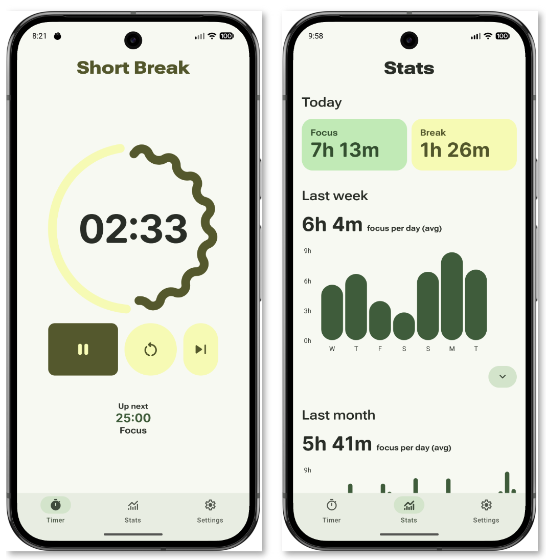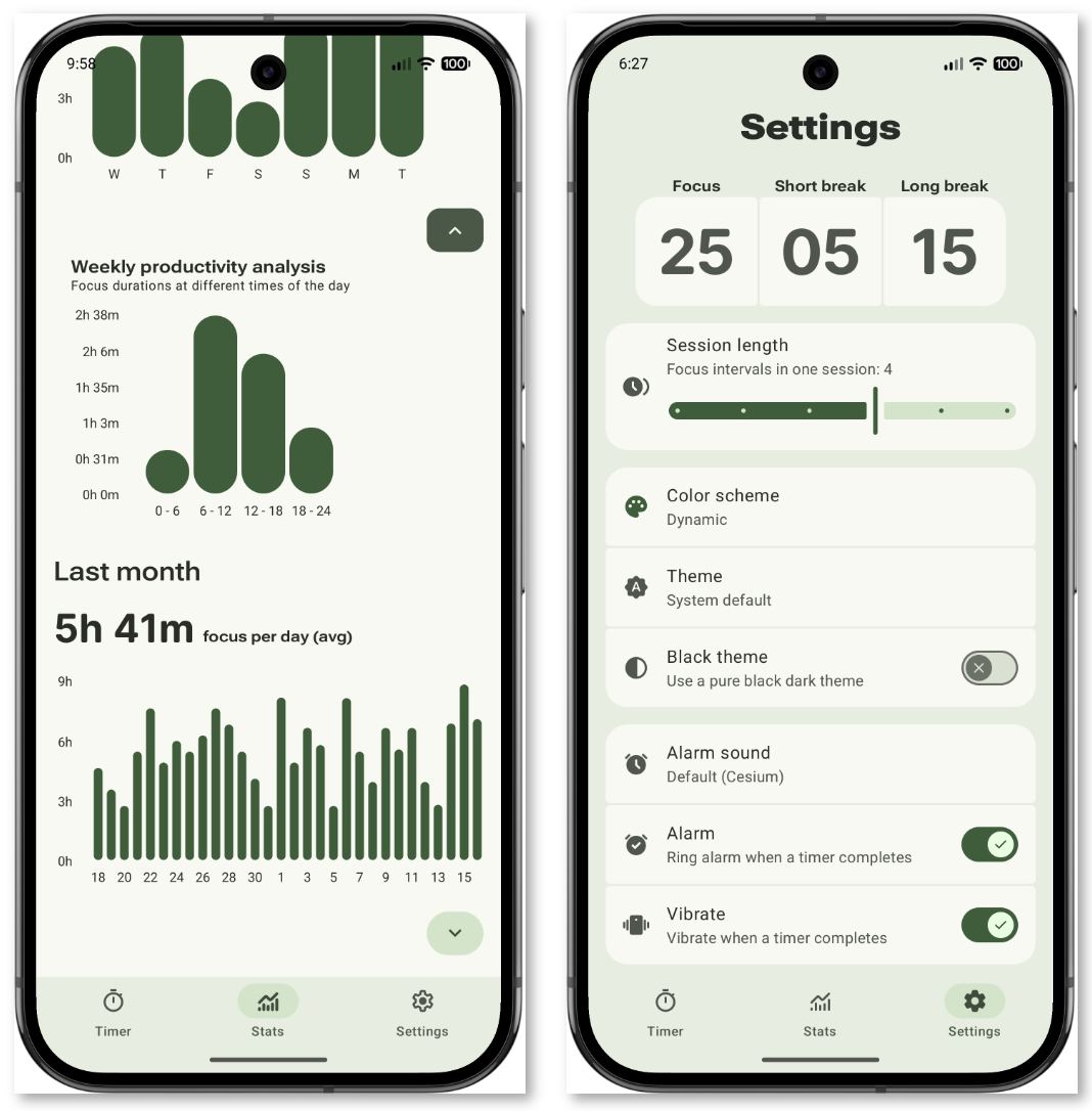 Pokud používáte Pomodoro techniku, Tomato je aplikace, kterou si zamilujete. Je to open-source, je krásně navržená v duchu Material 3 a nabízí přehledné statistiky produktivity. Největší její vychytávka jsou Live Updates – časovač se zobrazuje i mimo aplikaci v notifikační liště. Navíc je zdarma a bez reklam. Skvělý pomocník pro soustředění.