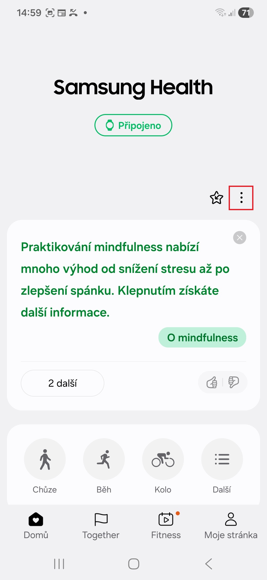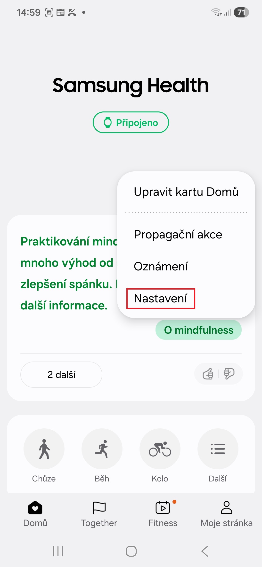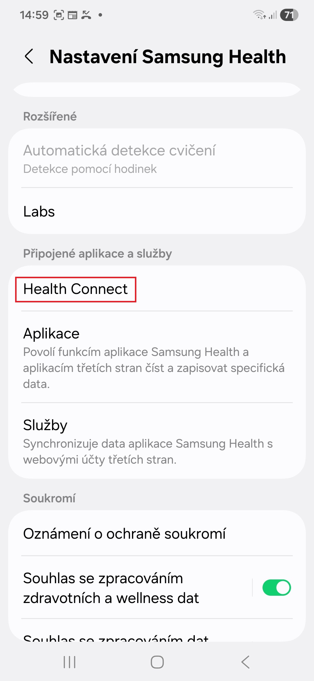 Pokud jste na svém telefonu Galaxy toto oznámení dosud neobdrželi, přejděte v aplikaci Samsung Health do Nastavení a v rámci sekce Připojené aplikace a služby vyberte možnost Health Connect. Dále postupujte podle pokynů na obrazovce.