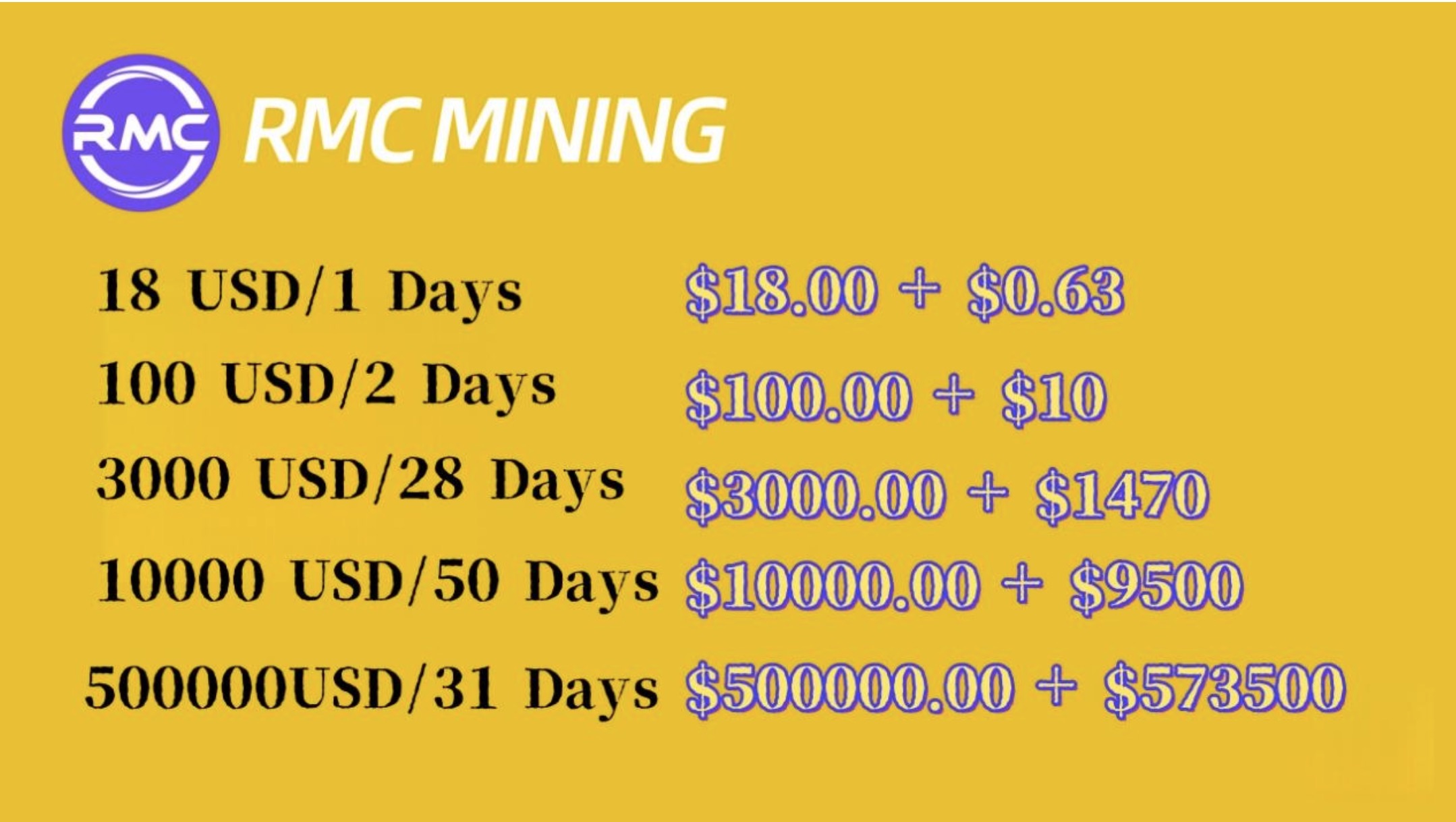 RMC MINING v současné době nabízí řadu těžebních smluv, například v hodnotě 100, 800 a 500 000 USD, přičemž každá z nich má jedinečnou návratnost investic (ROI) a specifickou dobu trvání smlouvy.