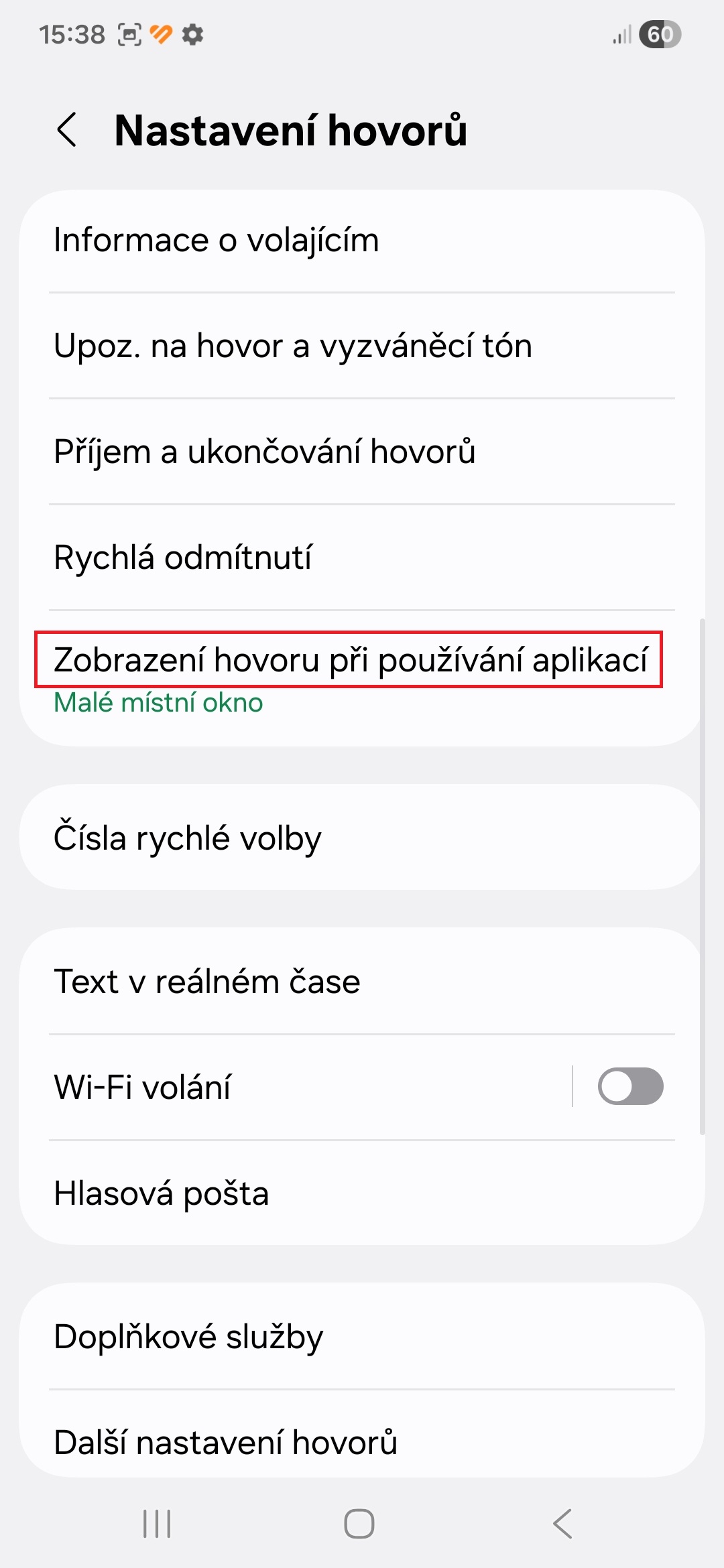 • Klepněte na položku Zobrazení hovoru při používání aplikací.