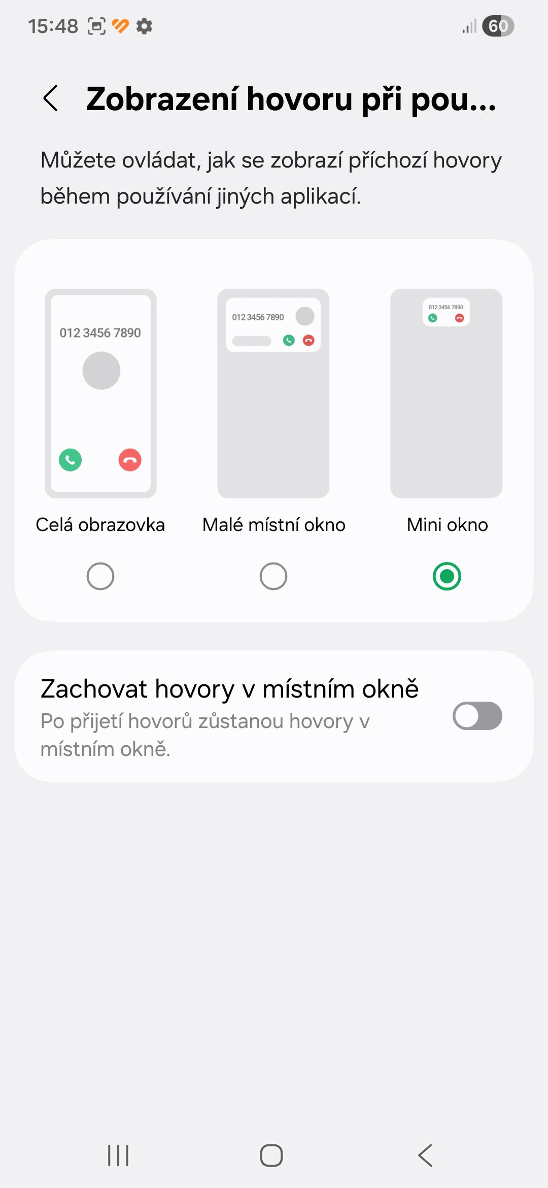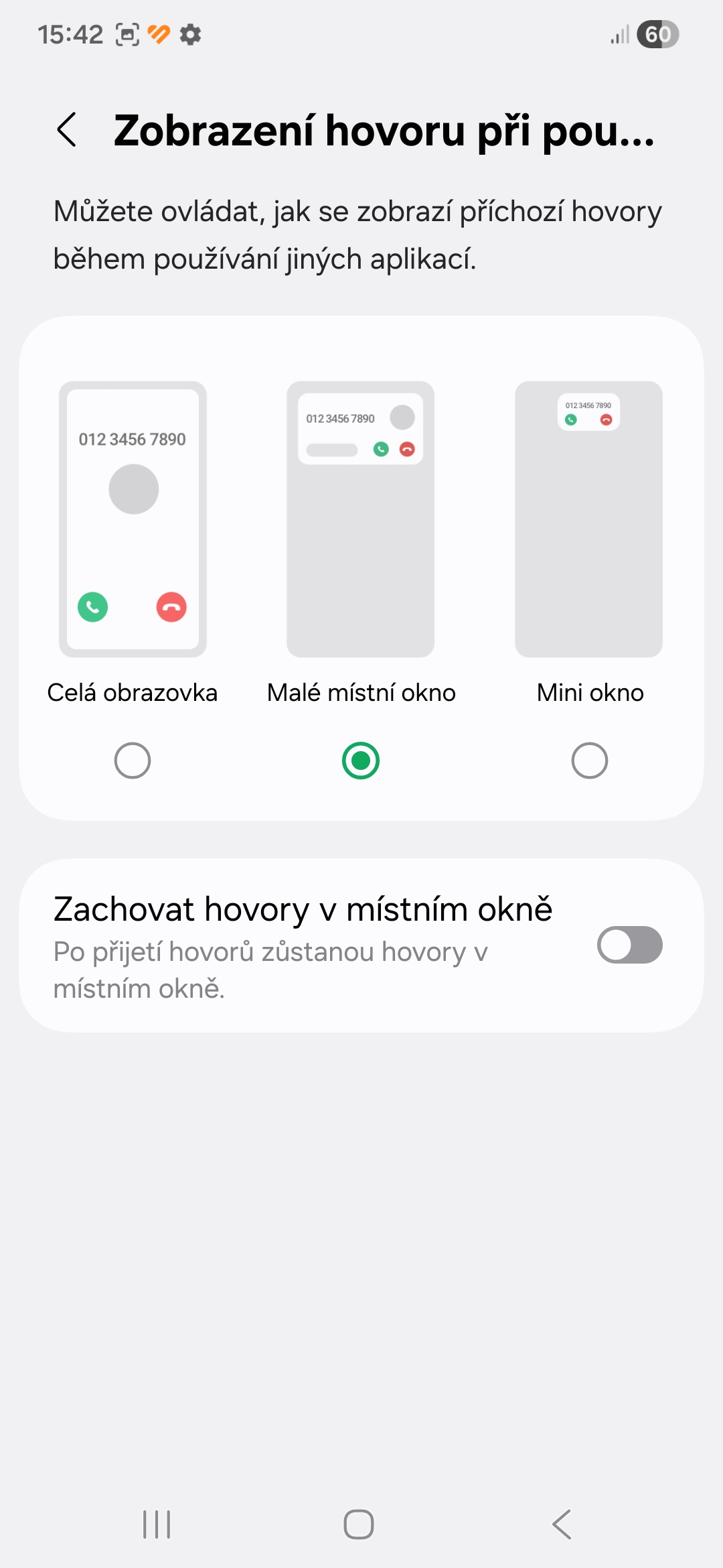 • Vyberte, jak se mají příchozí hovory během používání jiných aplikací zobrazovat. Na výběr jsou možnosti Celá obrazovka, Malé místní okno (výchozí) a Mini okno. Pokud chcete, aby vás při používání jiných aplikací případný hovor co nejméně rušil, vyberte poslední zmíněnou možnost.