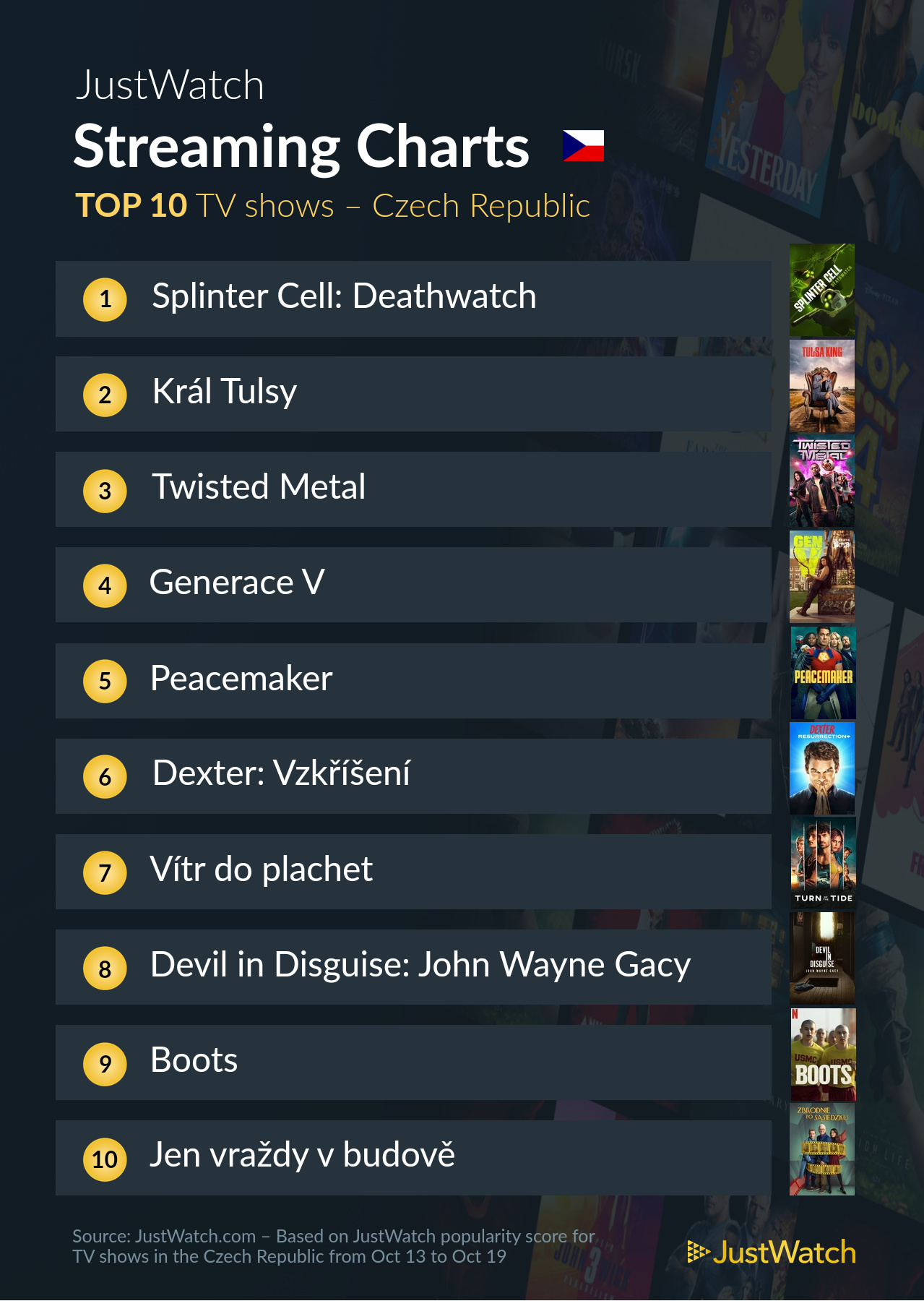 Splinter Cell: Deathwatch je animovaný Netflix seriál, který aktuálně vévodí celému žebříčku. Dvojkou je Král Tulsy ze SkyShowtime a trojkou Twisted Metal z HBO Max. Žebříček byl tvořen podle zájmu uživatelů platformy JustWatch od 13. do 19. října 2025.