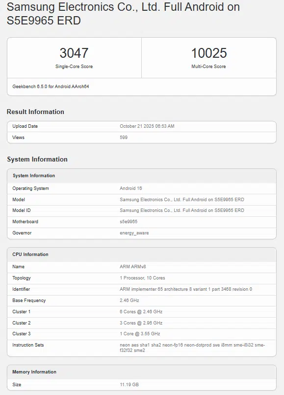 Z databáze Geekbench 6 už víme, že procesor Exynos 2600 se nechce nechat v otázce výkonu zahanbit. Byl ozkoušen sice jen na prototypu, ale z testů jsme se dozvěděli, že bude mít 10 jader CPU, přičemž jedno „prime“ jádro bude mít 3,80 GHz, 3 výkonnostní jádra nabídnou 3,26 GHz a 6 úsporných jader zvládne 2,76 GHz. Jednojádrové skóre Exynosu 2600 bylo ohodnoceno 3 309 body, z vícejádrového testu získal 11 256 bodů. Což jsou skvělé výsledky a budoucí majitele modelů Galaxy S26 by měly potěšit.