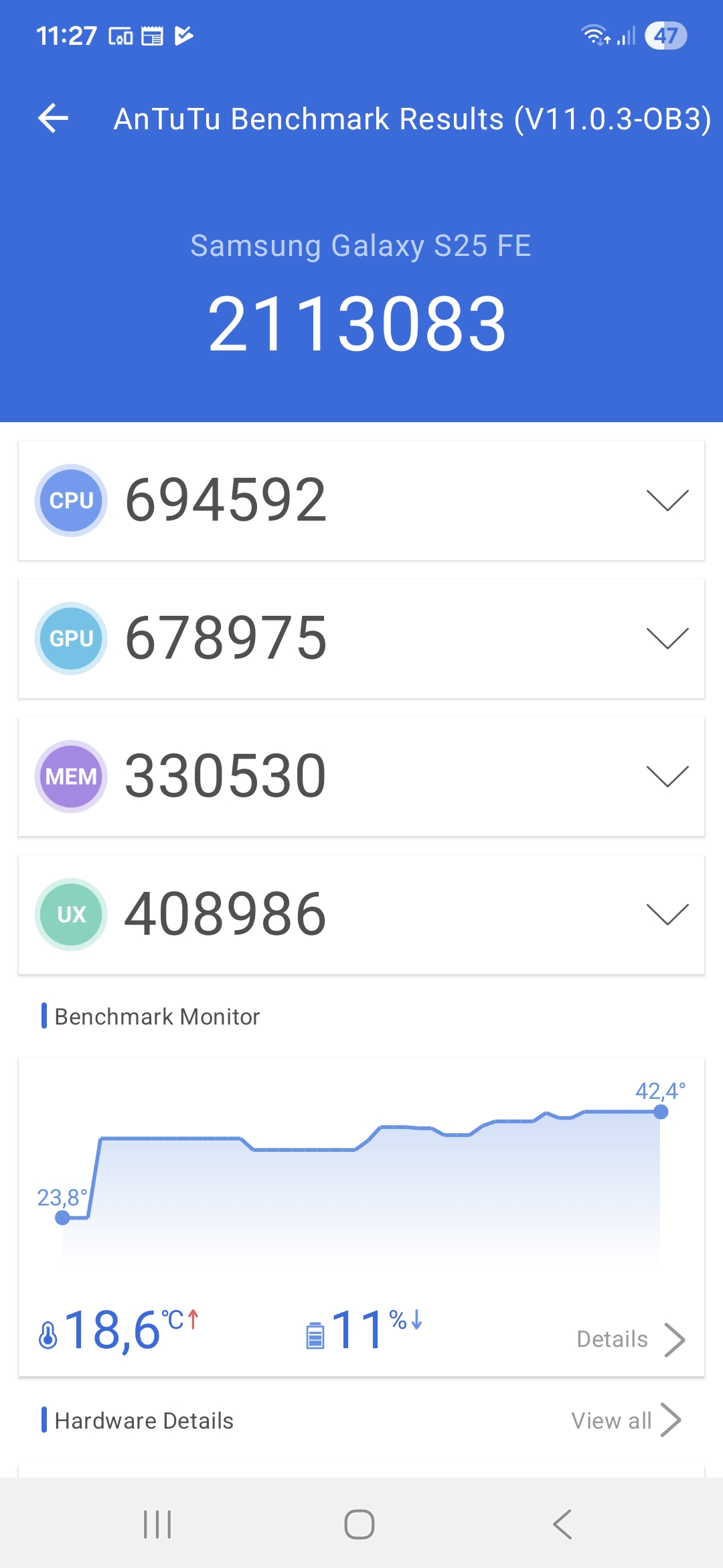 Galaxy S25 FE pohání čip Exynos 2400, který debutoval v loňské vlajkové řadě Galaxy S24 (lépe řečeno jej používaly mezinárodní varianty modelů Galaxy S24 a S24+). Ten je stále velice rychlý, což dokazují i benchmarky – v AnTuTu telefon získal 2 113 083 bodů a v Geekbenchi v testu jednoho jádra 1 975 a ve vícejádrovém 6 526 bodů. Jeho výkon stále stačí i na graficky náročné hry, jako je Shadowrun Legends a Battle Prime, které jsme testovali a které na telefonu běžely zcela hladce. Při delším hraní se však smartphone stejně jako předchůdce poměrně dost zahříval (to se však týká i plnohodnotných modelů, nejen „fanouškovských“).