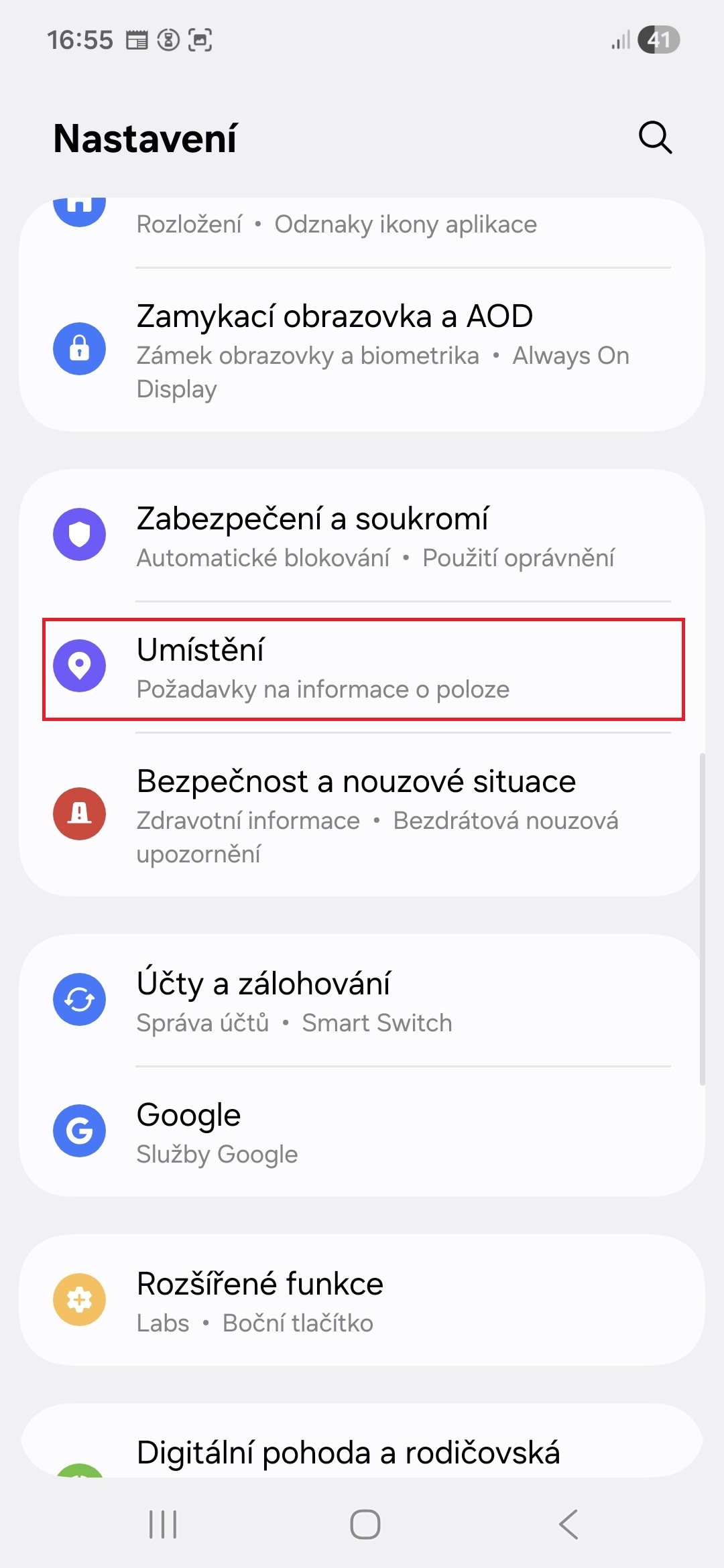 • Vyberte nabídku Umístění.
