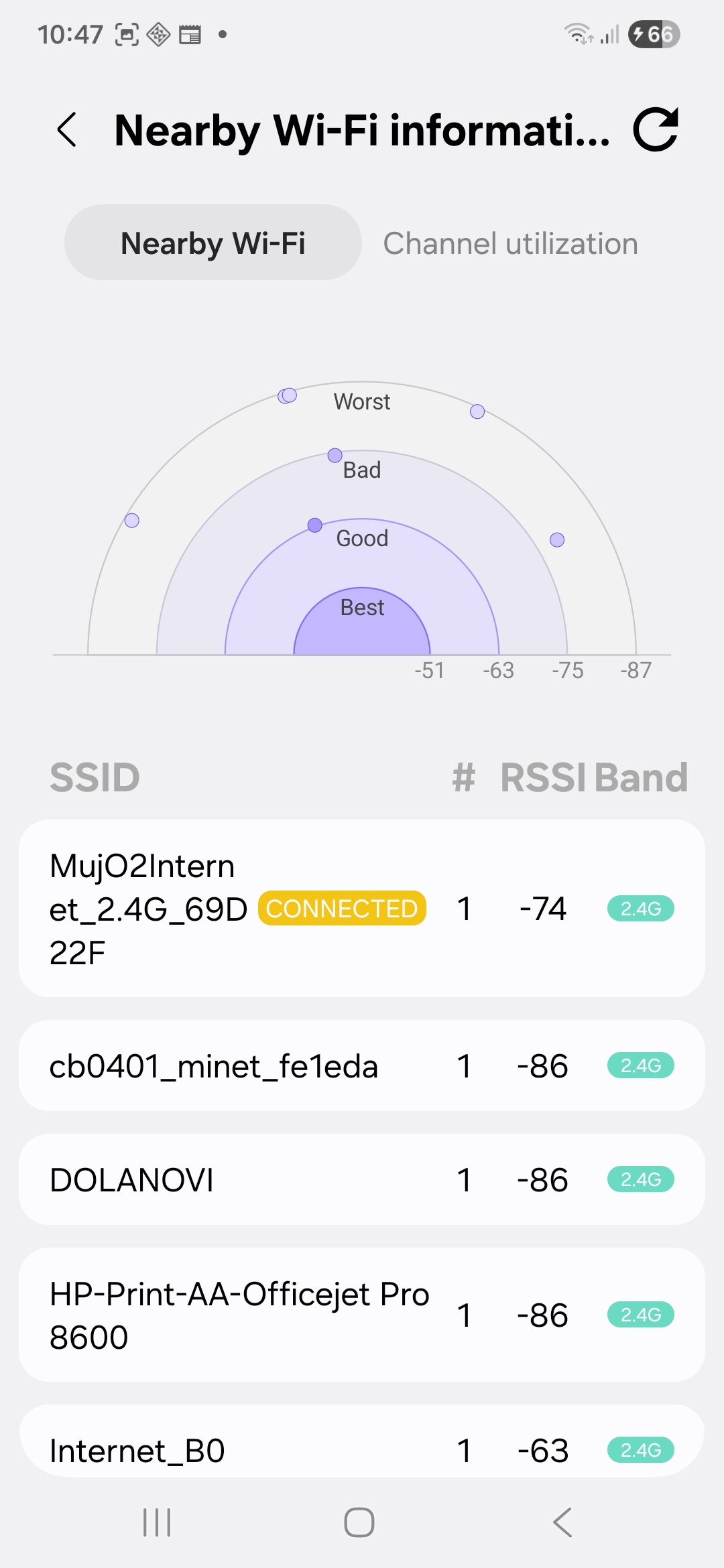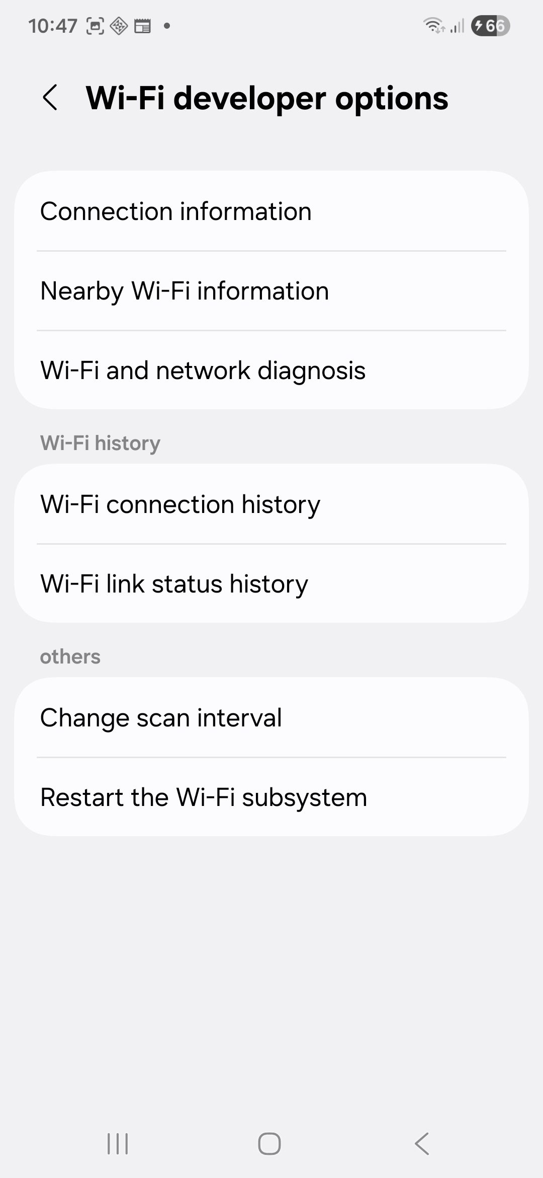 A pak je tu také možnost Wi-Fi developer options, která zobrazuje informace o blízkých sítích, včetně RSSI (indikátor síly přijatého signálu) a frekvenčních pásem. Pokud se tedy nacházíte na přeplněných místech, jako jsou letiště nebo kavárny, tento nástroj vám pomůže vybrat nejstabilnější dostupnou síť.