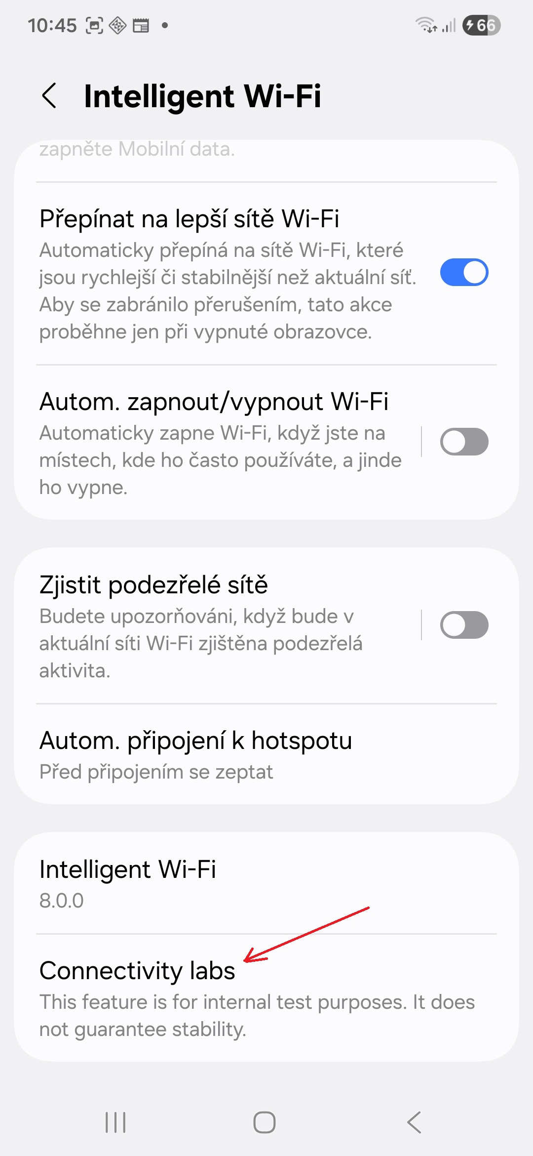 - Několikrát klepněte na položku Intelligent Wi-Fi 8.0.0, dokud se pod ní neobjeví nabídka Connectivity Labs.