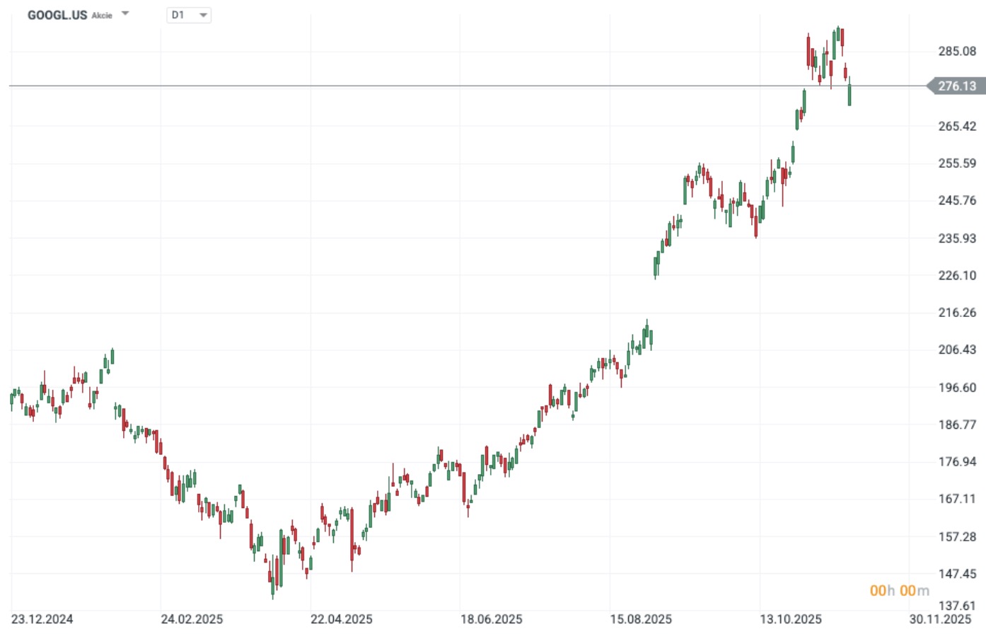 Vývoj akcií Alphabetu za poslední rok. Zdroj: xStation. Minulá výkonnost není spolehlivým ukazatelem budoucí výkonnosti.