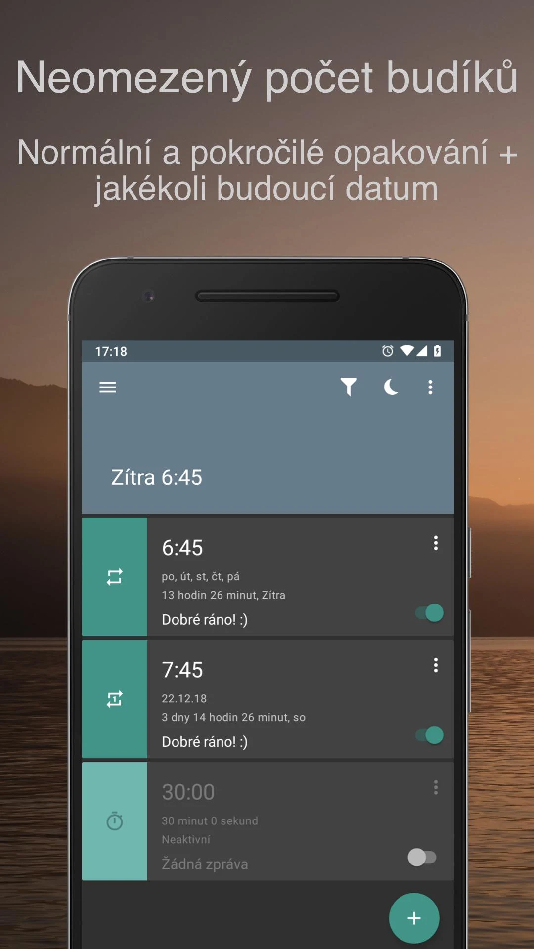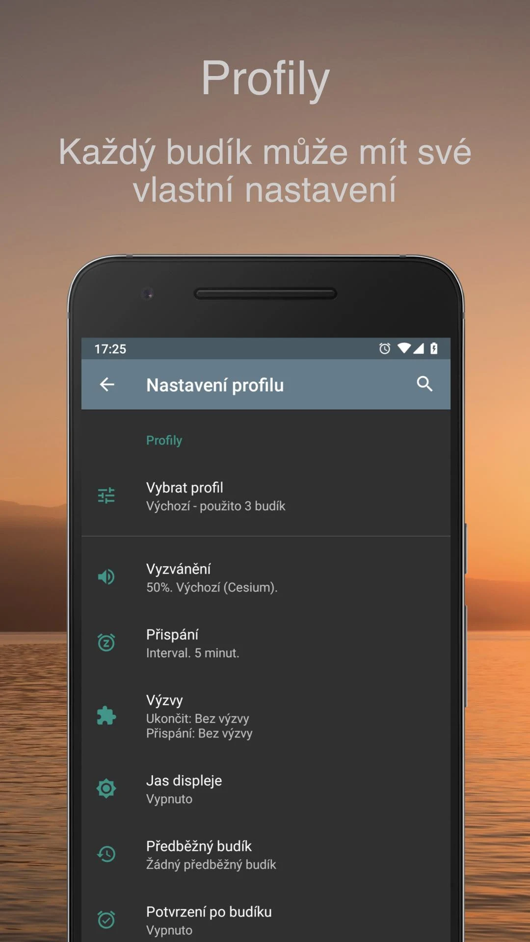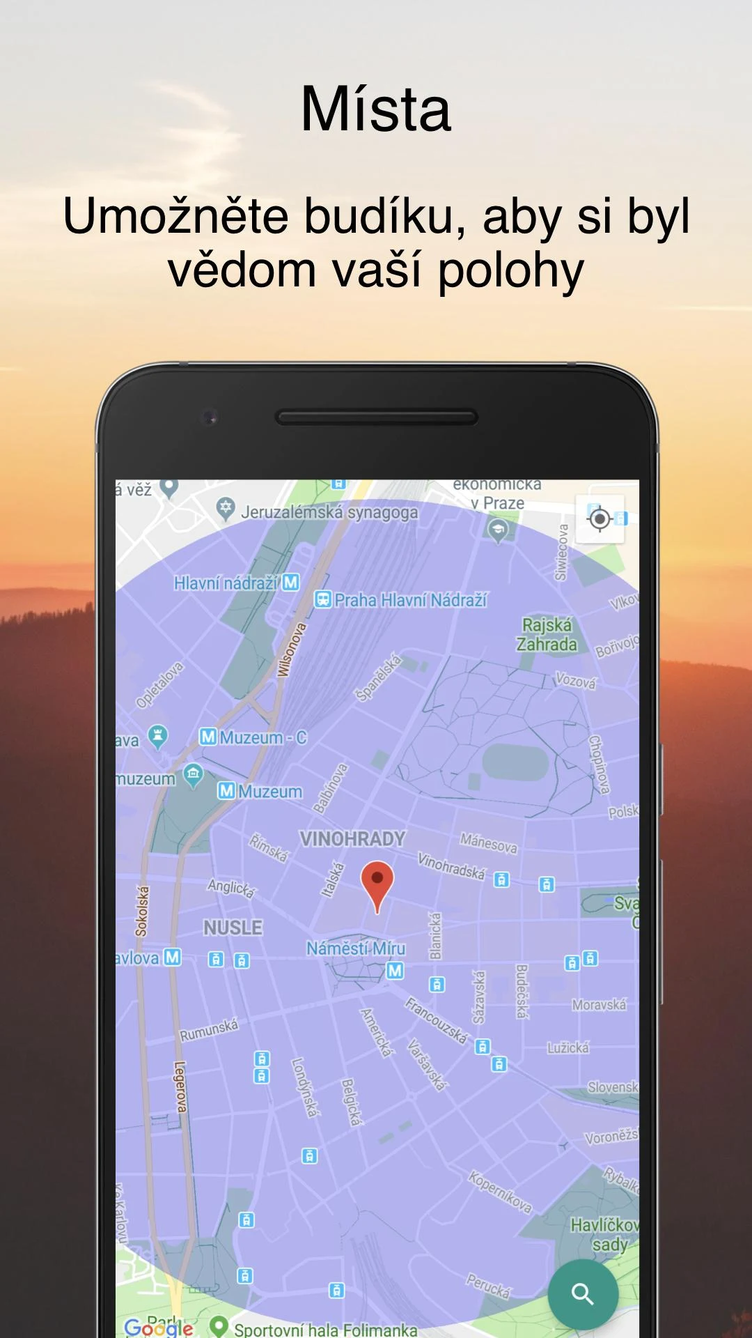 • Geolokační podmínky: Budík zvoní jen doma, nikoli na chatě a dovolené.