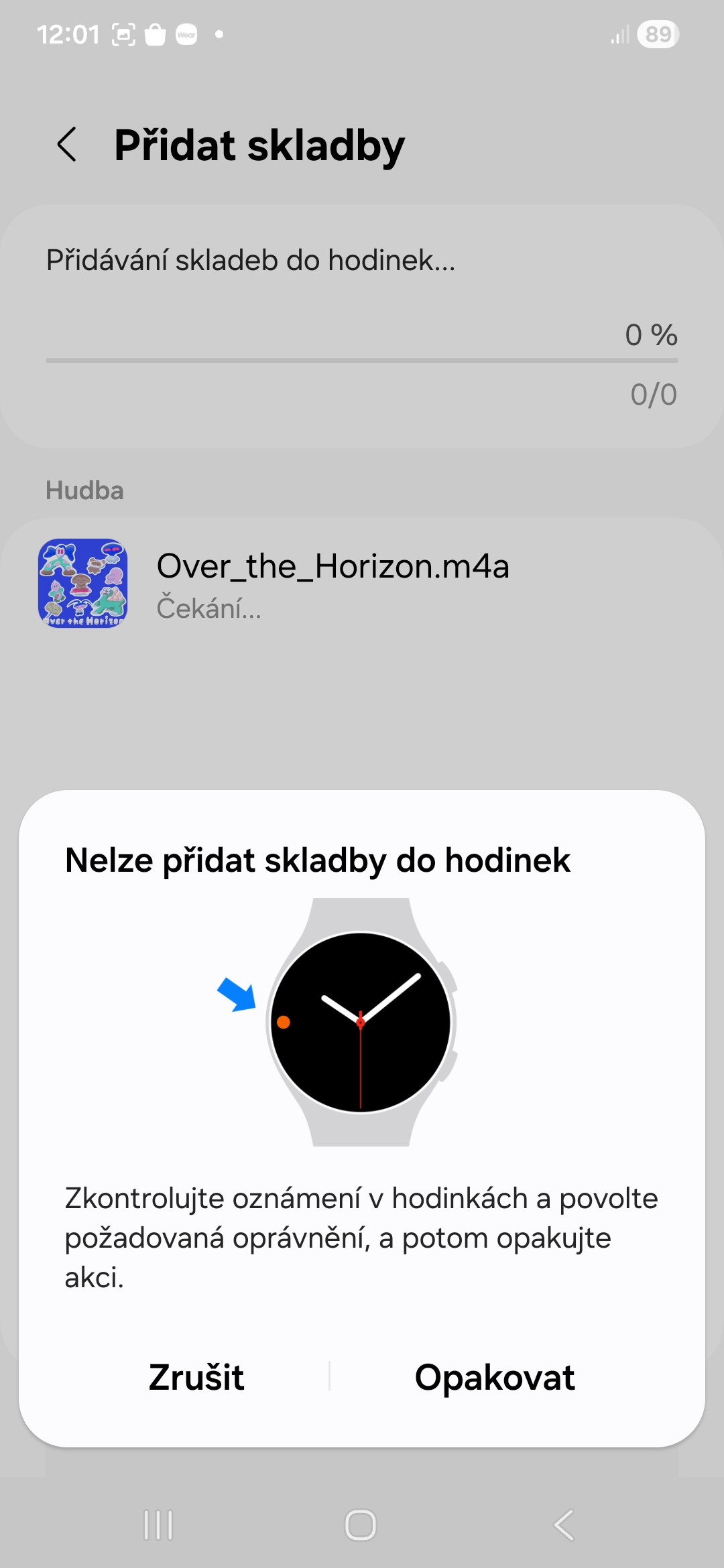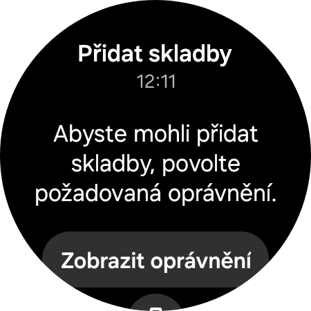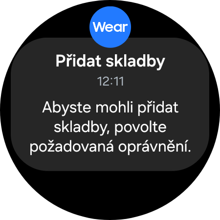 Pokud jsou váš telefon a hodinky propojeny, zobrazí se indikátor průběhu a zpráva „Přidávání skladeb do hodinek…“. Protože však může jít o první přenos zvukových souborů z telefonu do Galaxy Watch, bude možná nutné povolit některá oprávnění. Na hodinkách přejděte do oznámení a ujistěte se, že jste aplikaci Galaxy Watch Music povolili přidávání skladeb a přístup k hudebním souborům ve vašem úložišti.