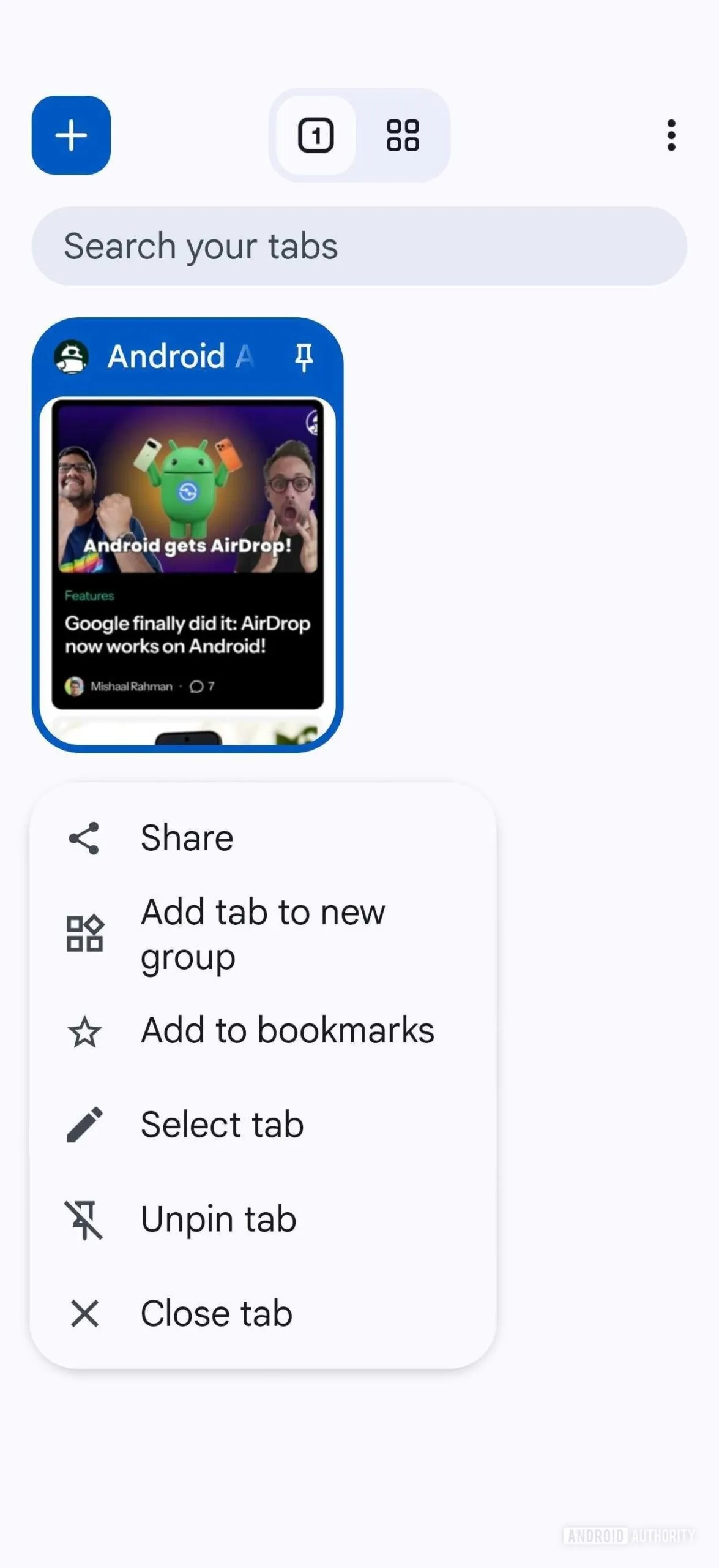 Novou možnost objevil web Android Authority v nejnovější verzi aplikace Chrome Canary pro Android a není skrytá za žádnými příznaky, které je třeba ručně zapínat. Místo toho stačí dlouze stisknout jednu z karet, které máte v prohlížeči otevřené, a do seznamu se přidá nová možnost „Pin tab“ (připnout kartu).