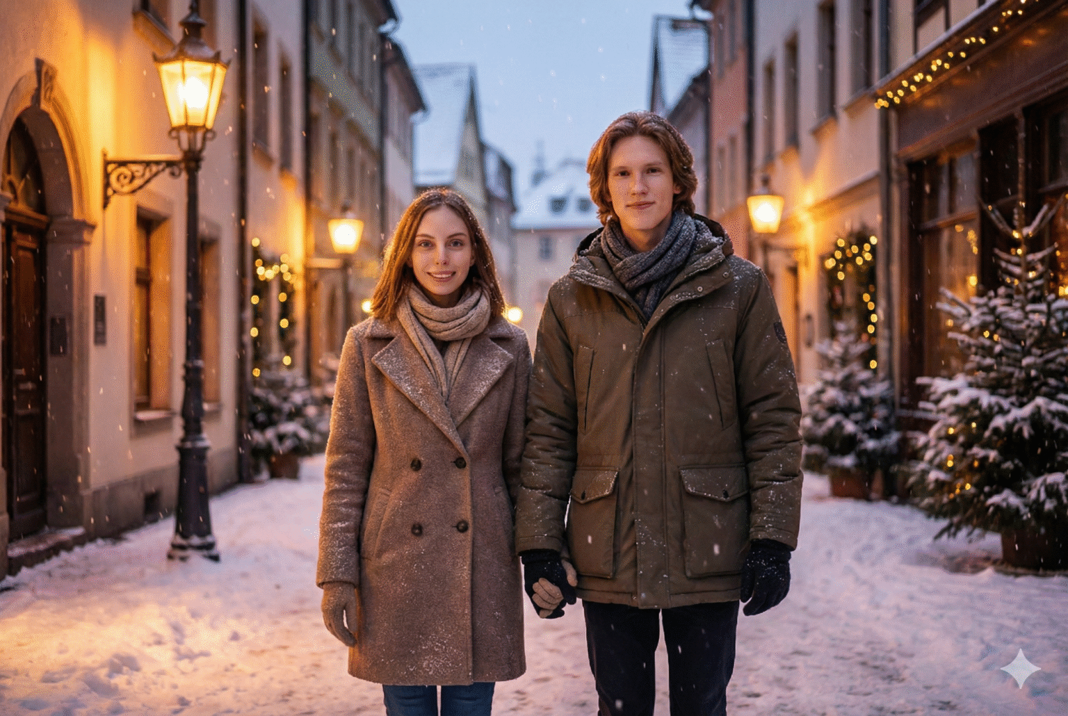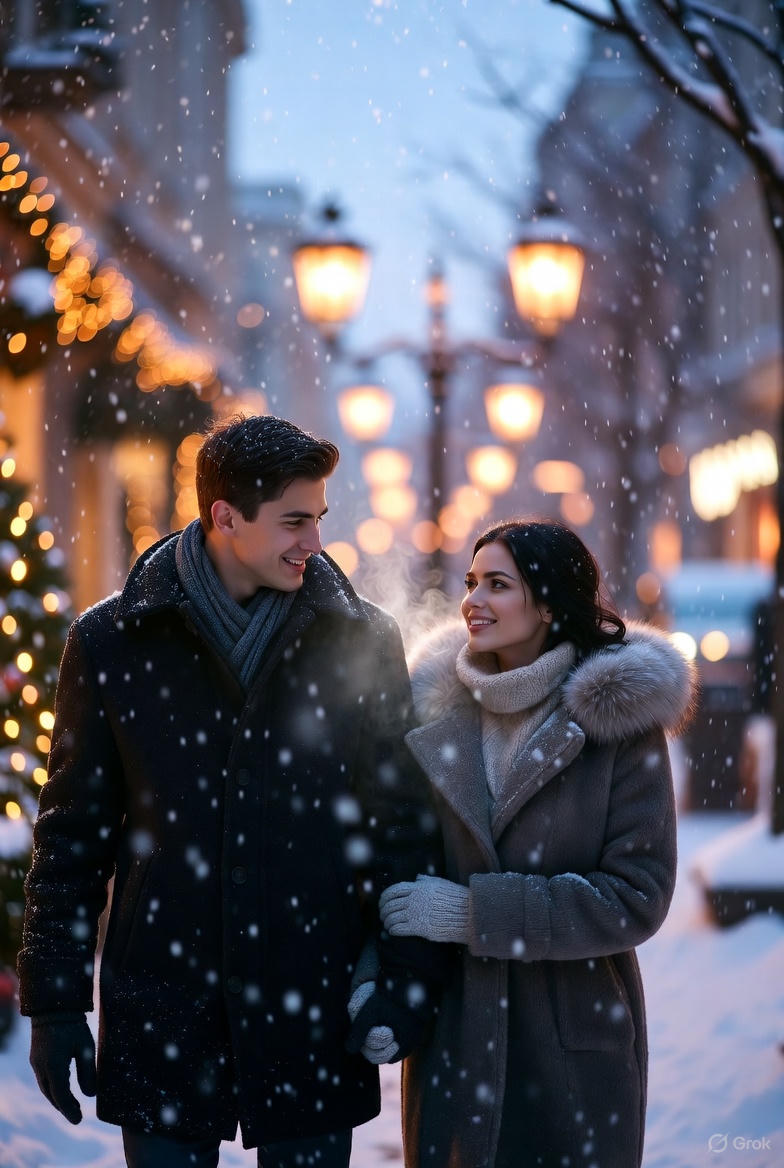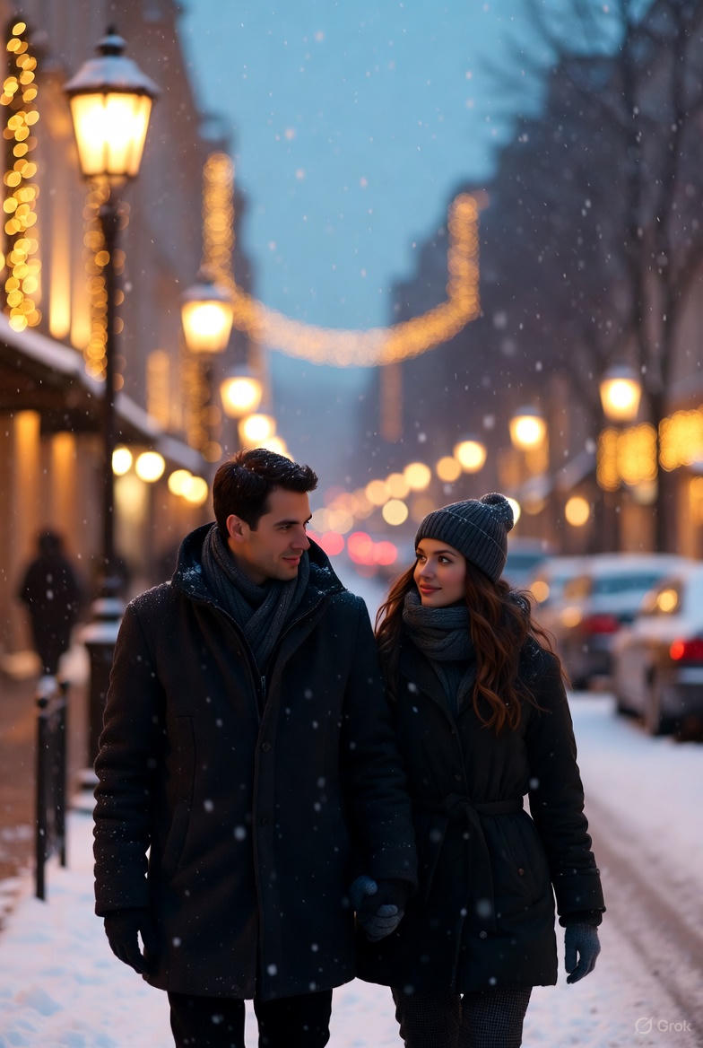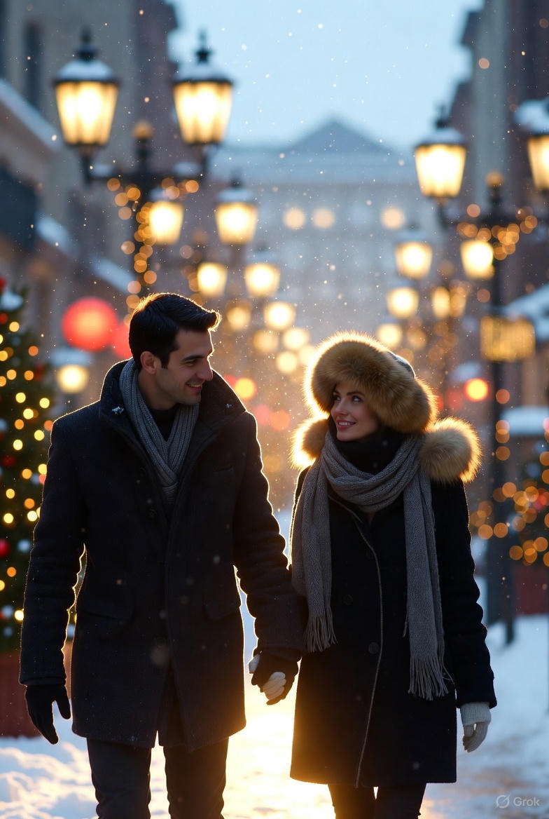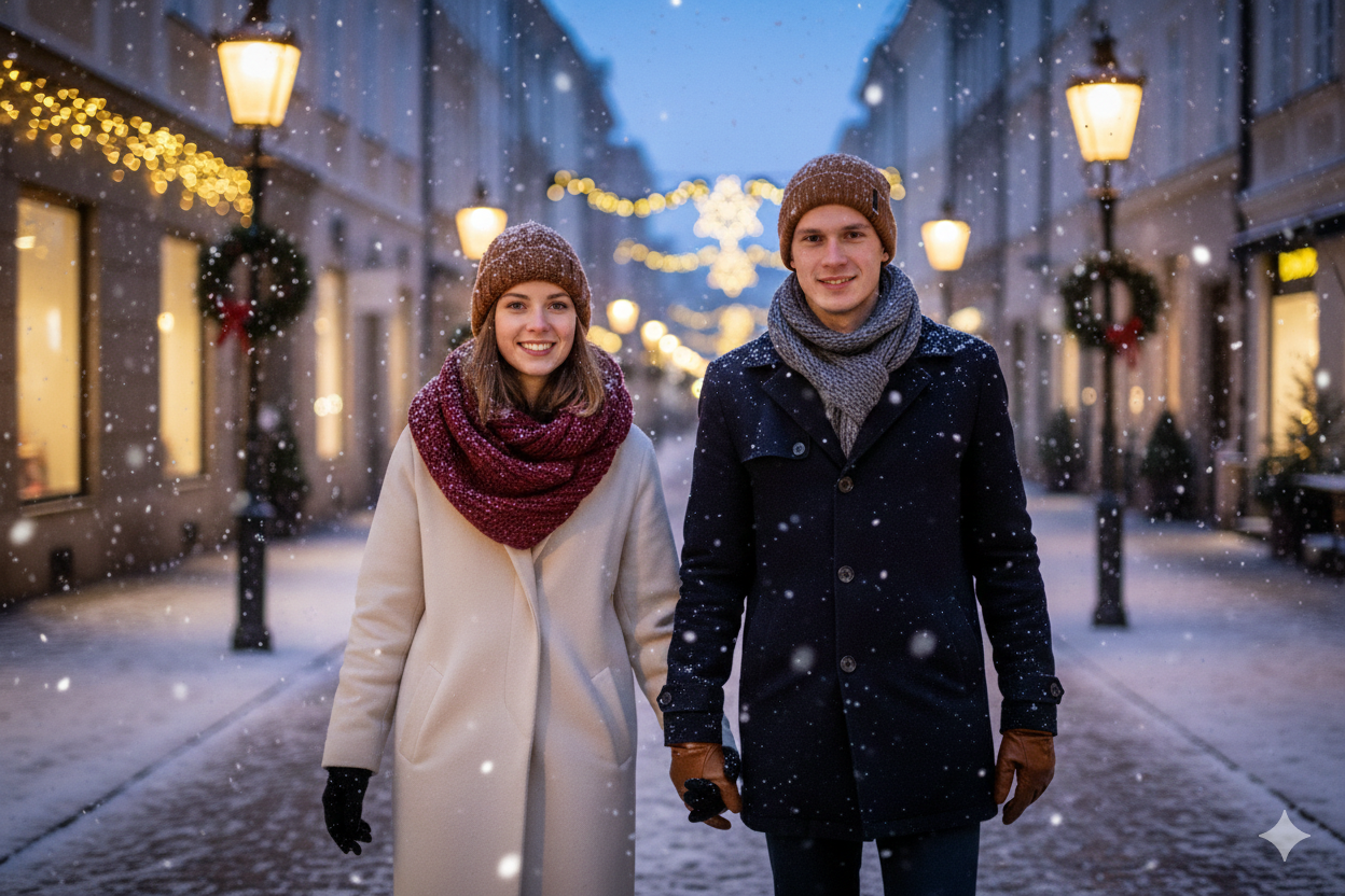 - Vytvoř zimní adventní scénu s párem držícím se za ruce při romantické procházce městem. Jemně padající sníh, městské lampy a drobná vánoční světýlka v pozadí, večerní soumrak, intimní a teplé světlo odrážející se od jejich tváří. Nahraď postavy ve scéně fotografií uživatele a jeho partnera. Postavy se dívají před sebe, jsou oblečeny v zimním oblečení, šály, rukavice, kabáty. Atmosféra klidná, mírná, plná lásky a předvánočního kouzla. Zajisti jemné detaily: lehký sníh na kabátech, světélkující lampy, drobné světelné odlesky na sněhu.