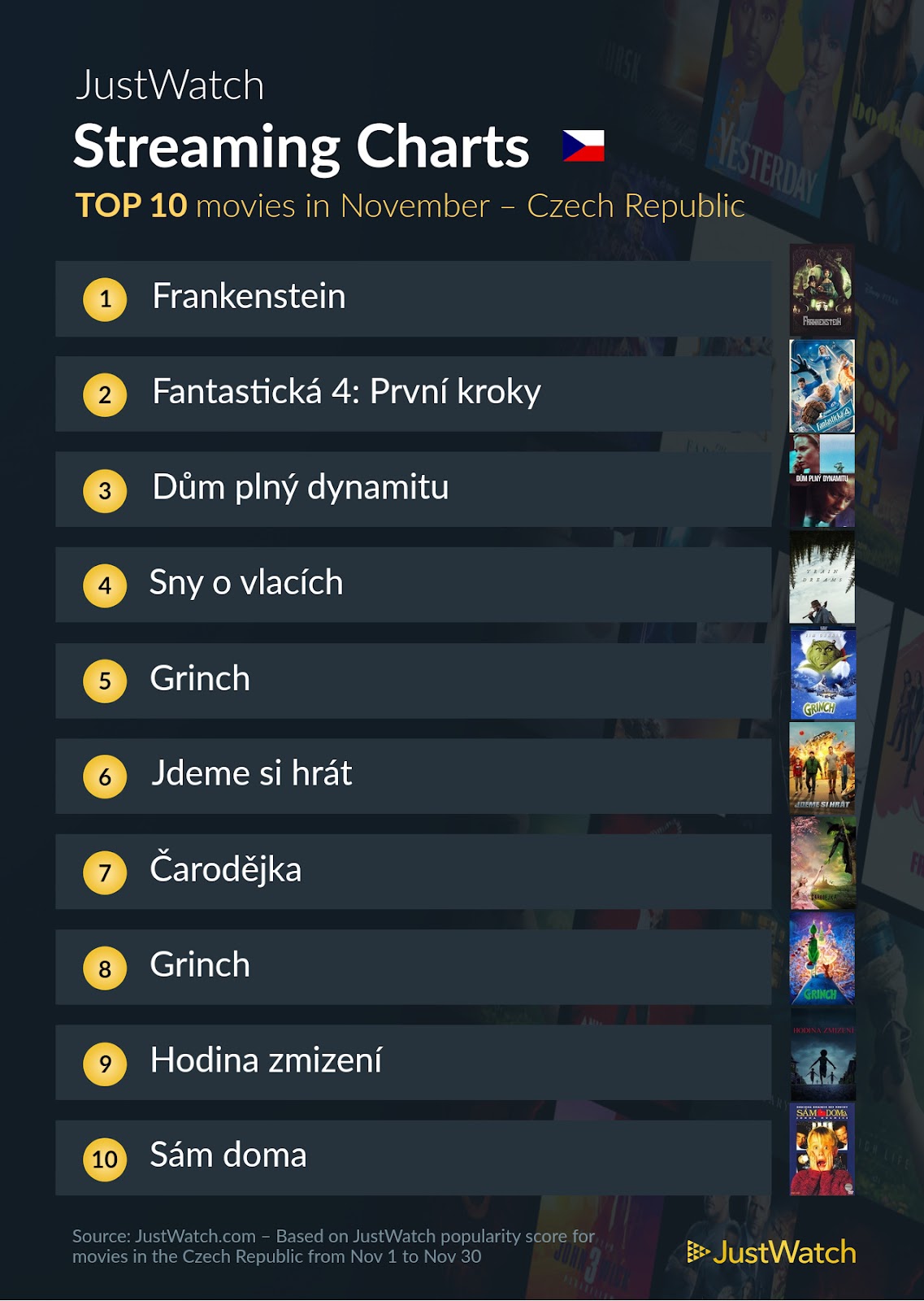 Vyjma přehledu za minulý týden máme i ten za celý listopad (od 1. do 30. 11. 2025). V něm si mezi filmy nejlépe vedly snímky Frankenstein (Netflix), Fantastická 4: První kroky (Disney+) a Dům plný dynamitu (Netflix). Mezi seriály byla první trojice v podobě Maxton Hall: Svět mezi námi (Prime Video), Stranger Things (Netflix) a TO: Vítejte v Derry (HBO Max).