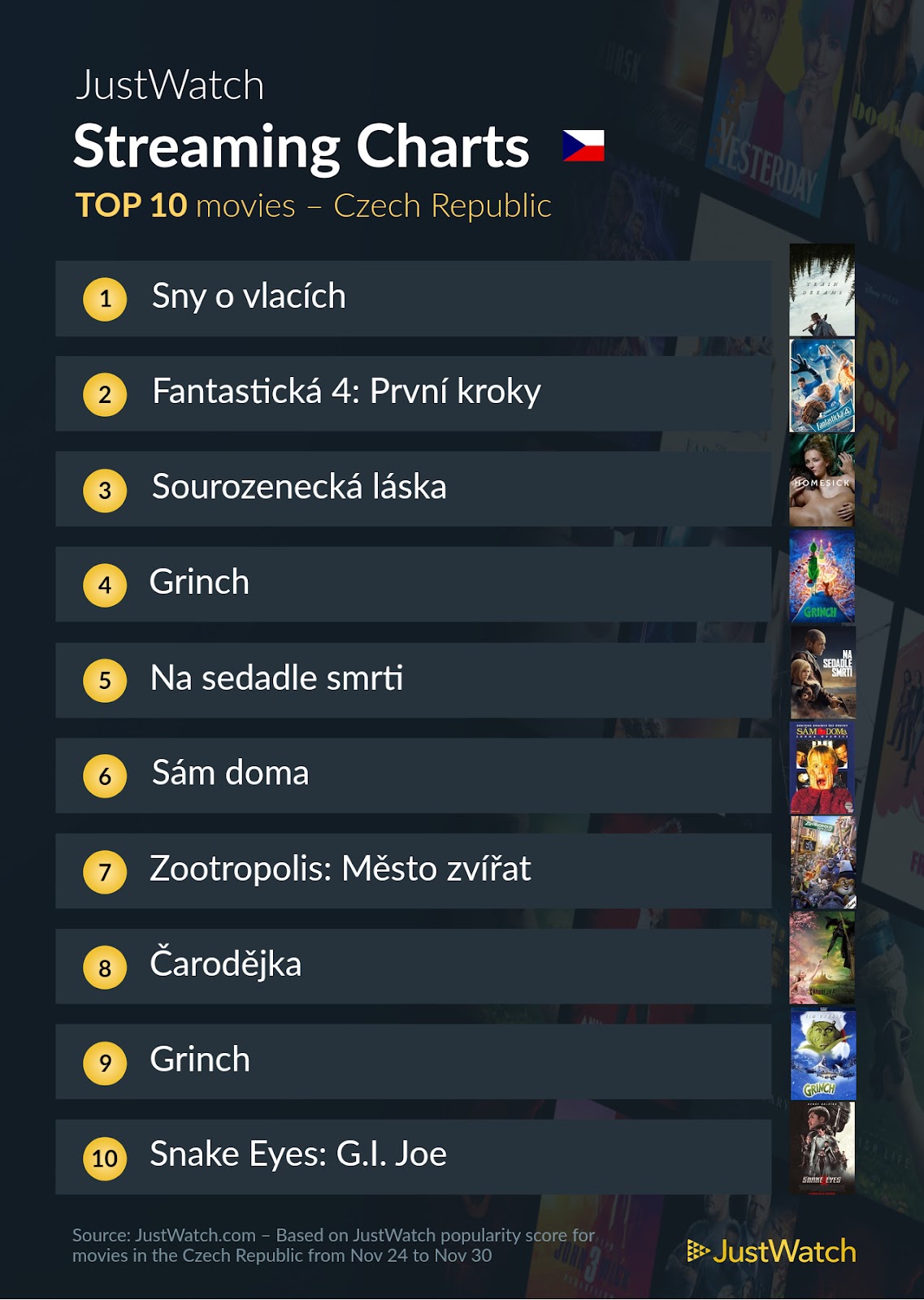 Sny o vlacích platformy Netflix zůstaly i za minulý týden na prvním místě zájmu diváků. Druhý dech nabrala Fantastická 4: První kroky z Disney+, která vypadala, že se se žebříčkem loučí, ale najednou poskočila z 8. místa na 2. Třetí pak byla Sourozenecká láska, tedy film z roku 2015, který vypráví o nešťastné učitelce tance Charlotte a jejím nevlastním bratru Henrikovi, kteří se poprvé potkají až jako dospělí a vznikne mezi nimi zakázaný vztah, který jim změní život. Jak to dopadne, můžete vidět v síti Netflix.