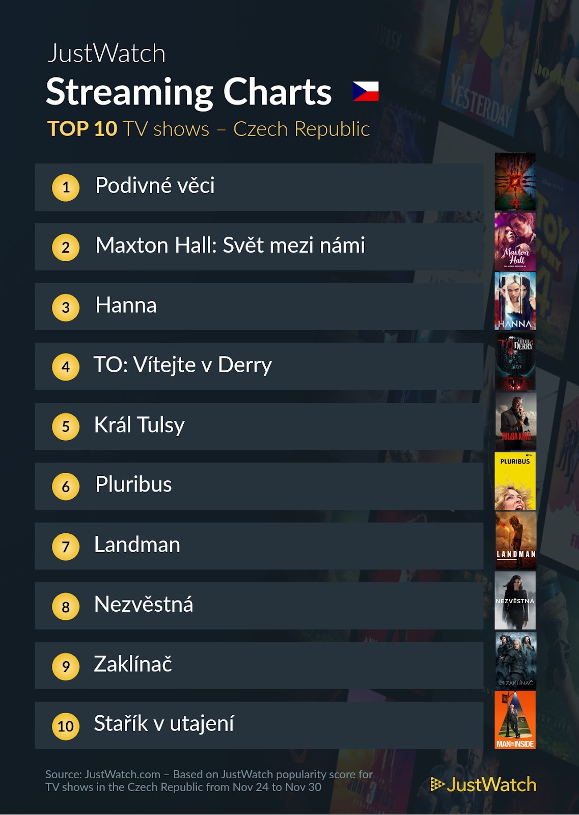 Seriálům nepřekvapivě vládnou Stranger Things z Netflixu. Na druhé místo tak spadla Maxton Hall: Svět mezi námi z Prime Video. Trojkou je Hanna z Prime Video a SkyShowtime. Minulá dvojka Pluribus z Apple TV spadla až na 6. místo, Zaklínač Netflixu z 5. na 9. a potvrzuje tak kontroverzi, která se kolem přeobsazení hlavního hrdiny udála. Seriál diváky už jednoduše netáhne a jeho budoucnost je značně nejistá. Žebříček byl tvořen na základě zájmu uživatelů platformy JustWatch od 24. do 30. listopadu 2025.
