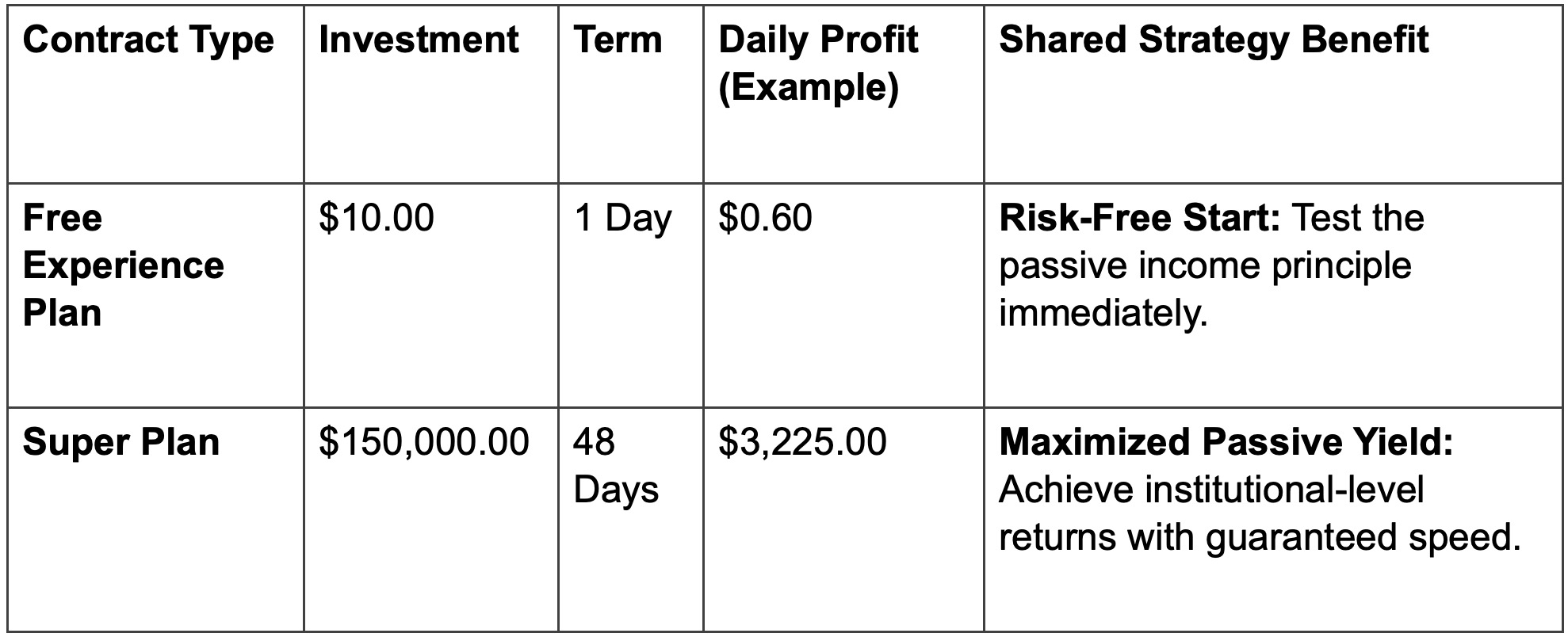 - Guaranteed Results: Unlike volatile trading, our contracts explicitly guarantee the return of both your principal and the fixed interest, ensuring your assets appreciate predictably.