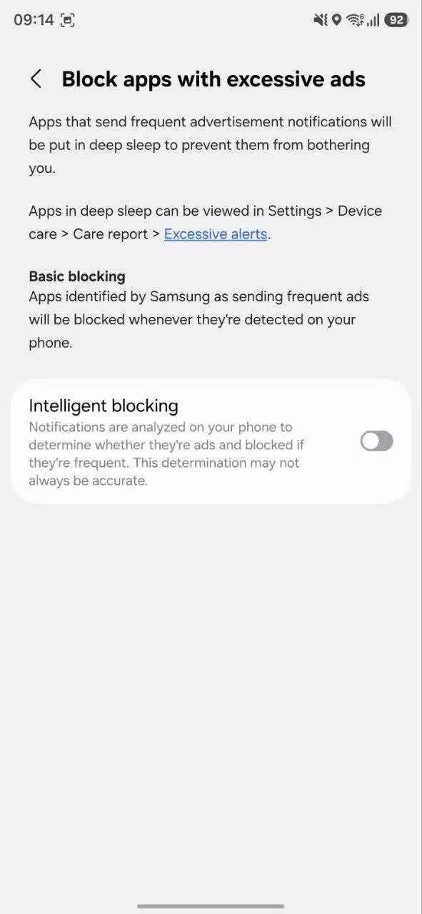 Zdá se, že Samsung vyvíjí dvouúrovňový systém, který automaticky detekuje a kontroluje aplikace opakovaně odesílající reklamní oznámení. Základní blokování (Basic Blocking) může používat předem určený seznam aplikací, o kterých je známo, že často odesílají reklamní oznámení. Pokud je v telefonu zjištěna jedna z těchto aplikací, One UI 8.5 automaticky zablokuje její reklamní oznámení a uvede ji do hlubokého spánku, aby vás přestala obtěžovat.
