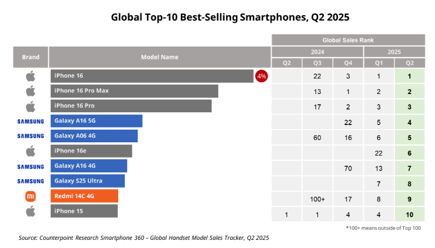 Samsung však celkově získal v Q3 hned pět míst v žebříčku, což je o jedno více než dříve. Tento posun je nicméně přičítán tomu, že analytická společnost oddělila prodeje modelů Galaxy A16 4G a A16 5G. Na samotném vrcholu se tradičně drží Apple, který obsadil všechna první tři místa s modely iPhone 16, 16 Pro a 16 Pro Max, čtvrtý je pak „levný“ iPhone 16e. Do žebříčku stihla promluvit i první zářijová novinka společnosti, a to iPhone 17 Pro Max, který je na 10. místě.