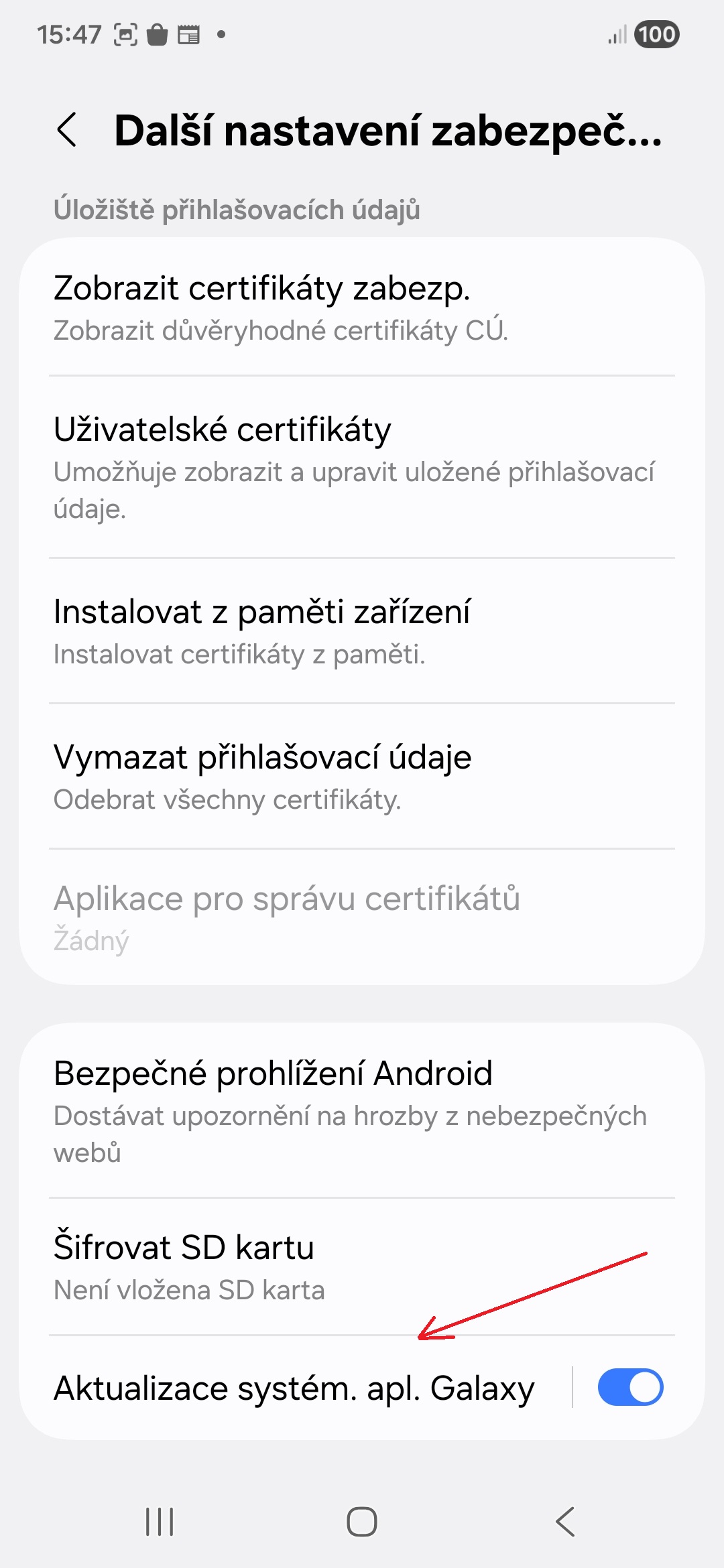 - Sjeďte úplně dolů a ujistěte se, že je zapnutý přepínač Aktualizace systém. apl. Galaxy.