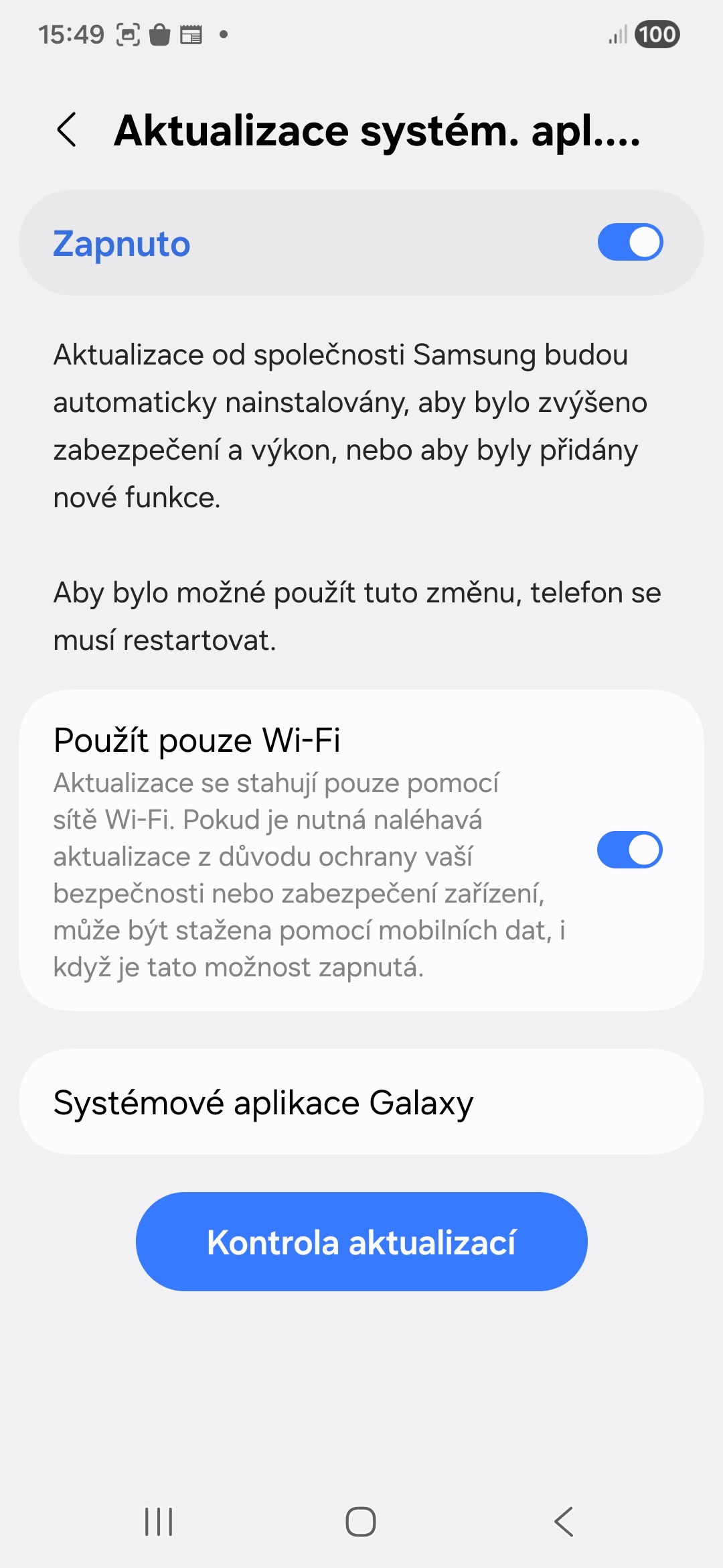 Dole uvidíte tlačítko Kontrola aktualizací, které vám umožní ručně spustit aktualizace, pokud jsou k dispozici. Najdete tu také sekci Systémové aplikace Galaxy se seznamem kritických systémových komponent, které na těchto aktualizacích závisejí. Zde uvedené aplikace fungují „v zákulisí“ a usnadňují správné fungování různých dalších aplikací a služeb.
