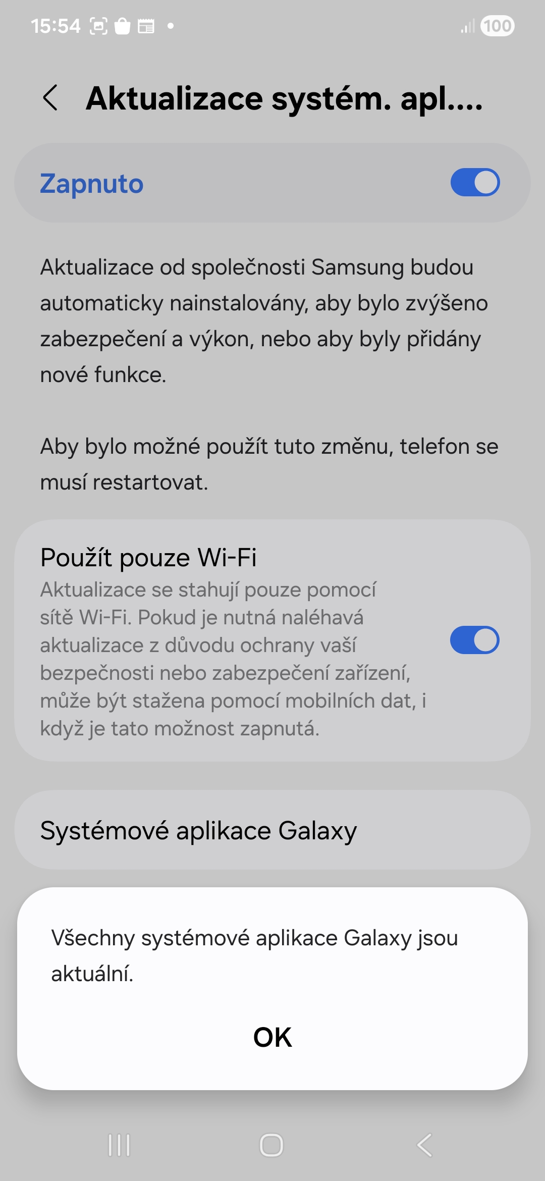 - Ve výchozím stavu zapnutý přepínač Používat pouze Wi-Fi vypněte, pokud chcete dostávat automatické aktualizace systémových aplikací přes mobilní data.