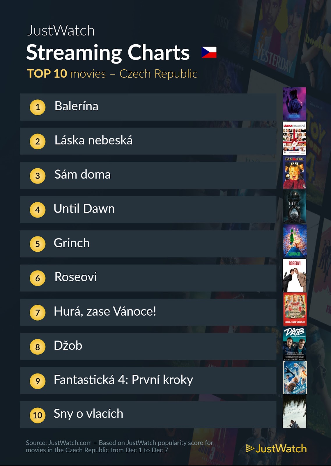 Balerína obsadila první místo mezi nejoblíbenějšími streamovanými filmy minulého týdne, i když je k dispozici jen k pronájmu nebo koupi v rámci Apple TV, Canal+ a YouTube. Po ní nastupuje vánoční atmosféra, protože dvojkou byla Láska nebeská, která je k dispozici ve OnePlay a třetí místo obsadila vánoční stálice Sám doma, kdy má tato franšíza domov v Disney+. Novinkový horor Until Dawn z HBO Max byl na 4. pozici, animovaný Grinch z roku 2018 na 5. (Prime Video, SkyShowtime). Netflixu patří až 8. příčka s tuzemským filmem Džob.