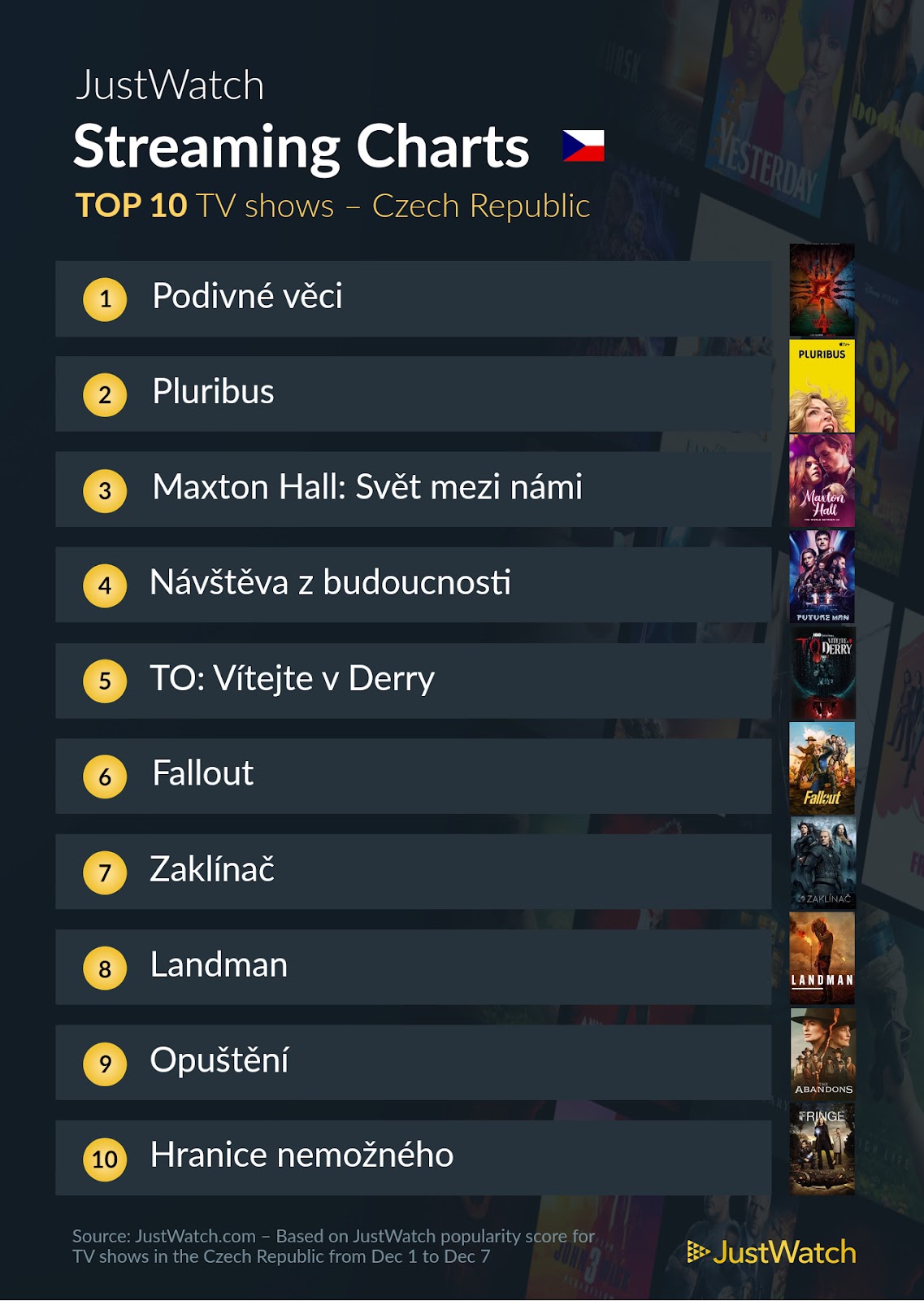 Seriálům nepřekvapivě pořád vládnou Stranger Things z Netflixu. Na druhé místo opětovně poskočil Pluribus z Apple TV a třetí pozice patřila Maxton Hall: Svět mezi námi z Prime Video. Nejvýše postavenou novinkou byla na 4. místě Návštěva z budoucnosti, kterou jde vidět na Netflixu. Žebříček byl tvořen na základě zájmu uživatelů platformy JustWatch od 1. do 7. prosince 2025.