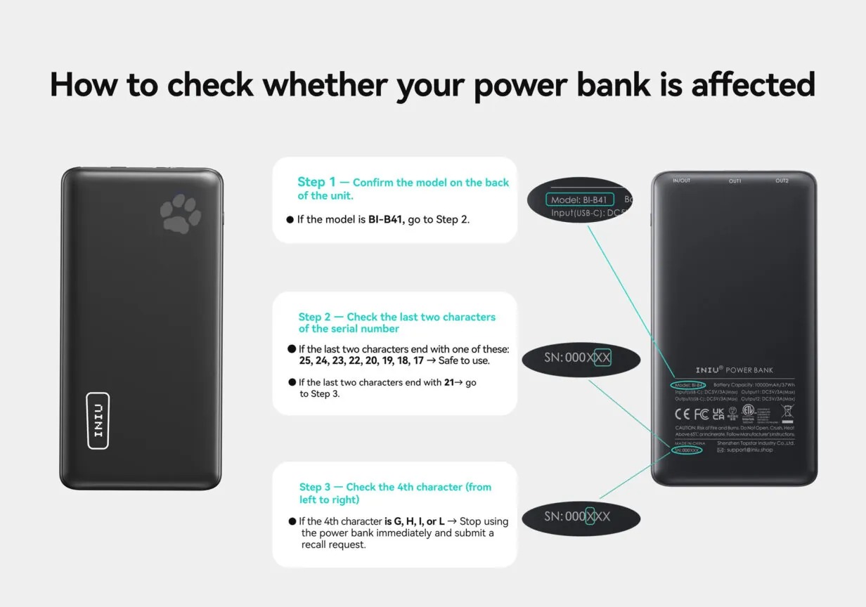 Pokud vlastníte přenosnou powerbanku INIU s kapacitou 10 000 mAh (model BI-B41), ale nenese jedno ze čtyř výše uvedených sériových čísel, můžete ji nadále používat jako obvykle. Pokud se však model a sériové číslo shodují, doporučuje se powerbanku okamžitě přestat používat.