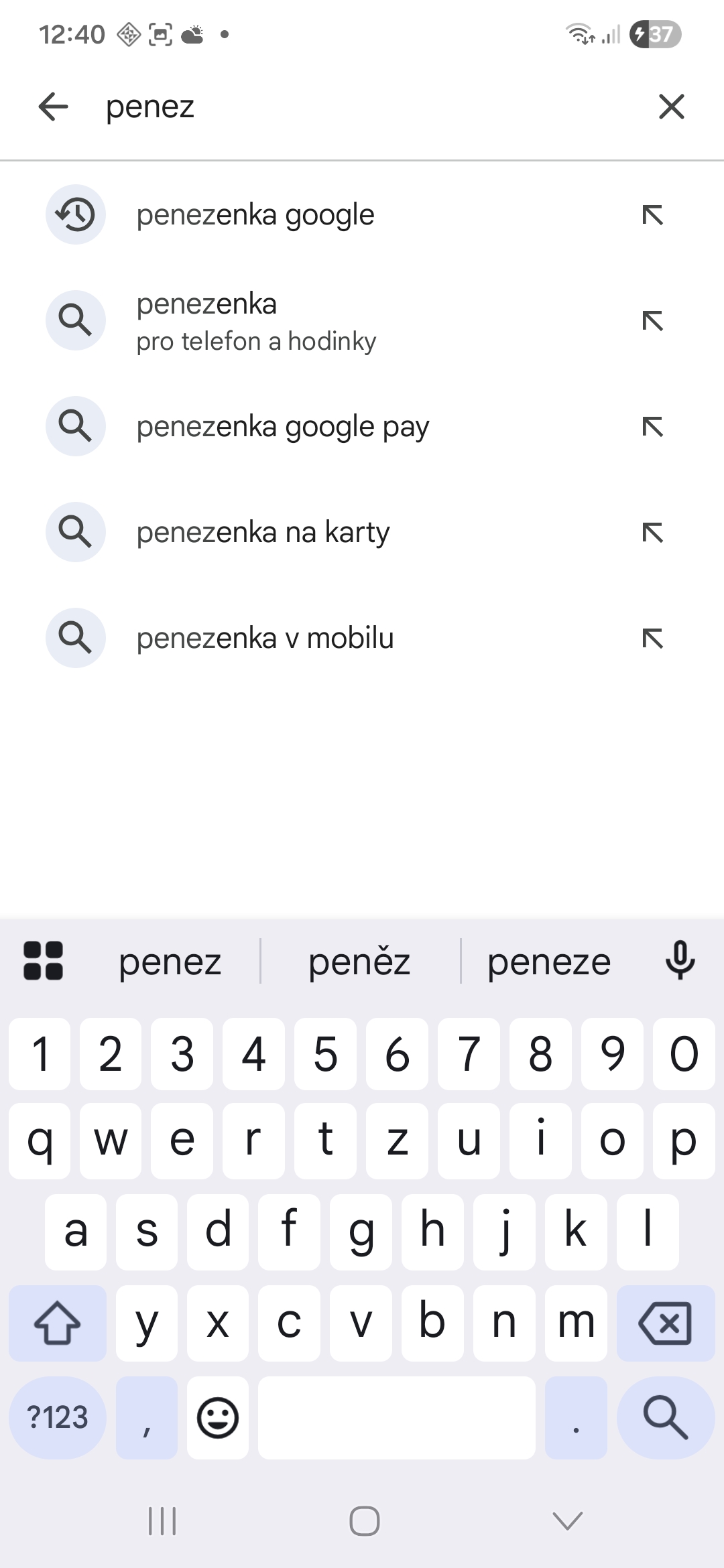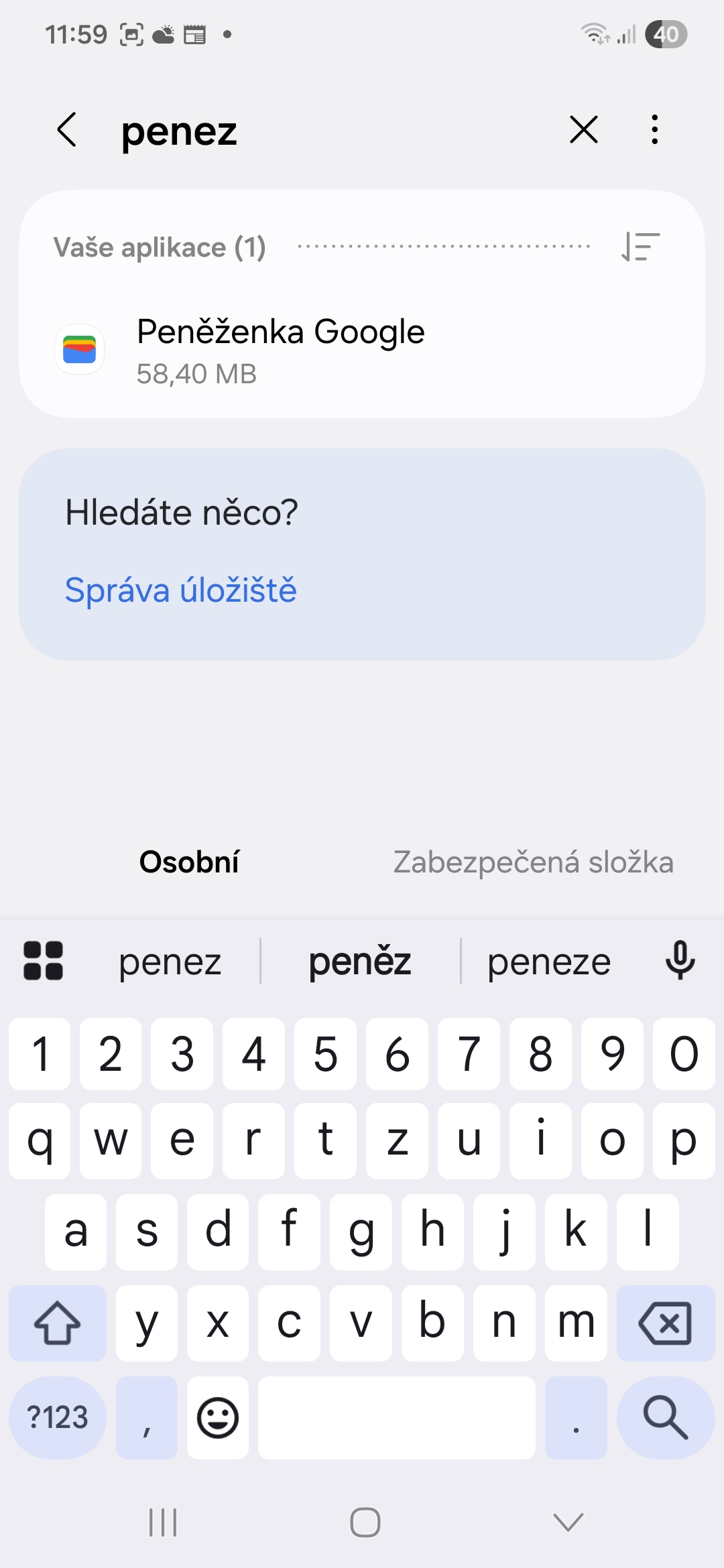 - Vyhledejte Peněženku.