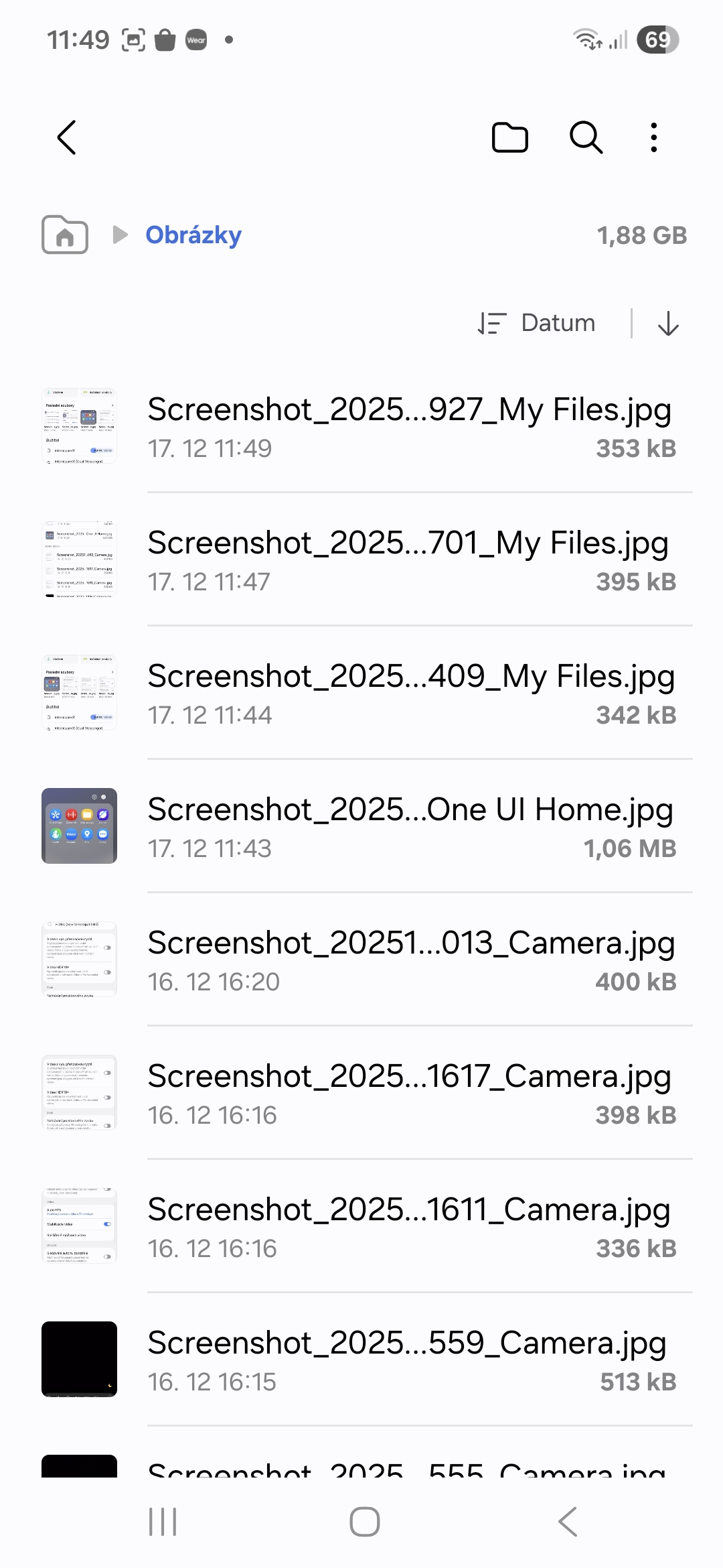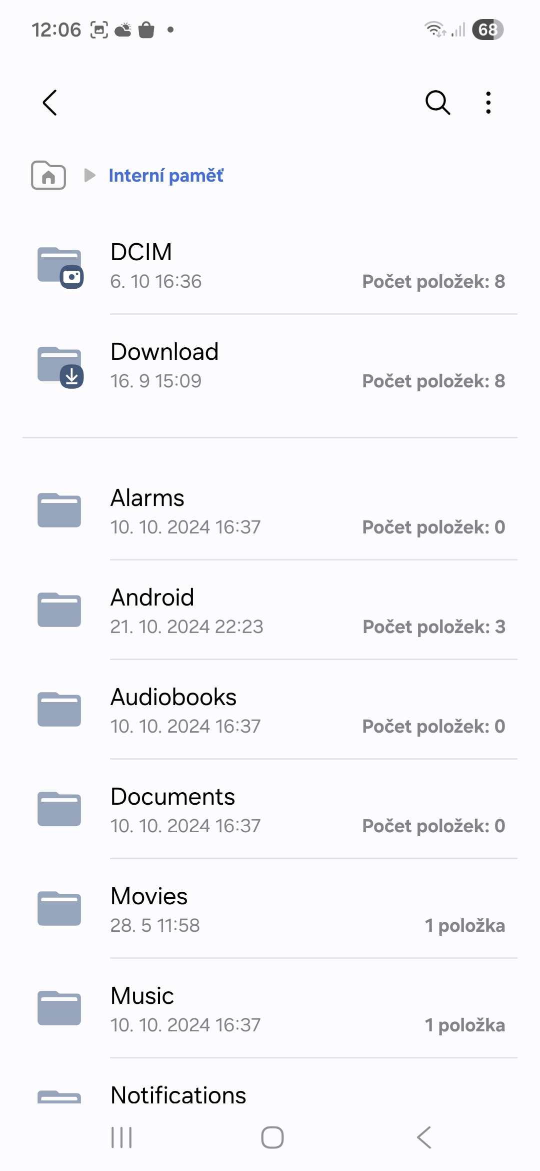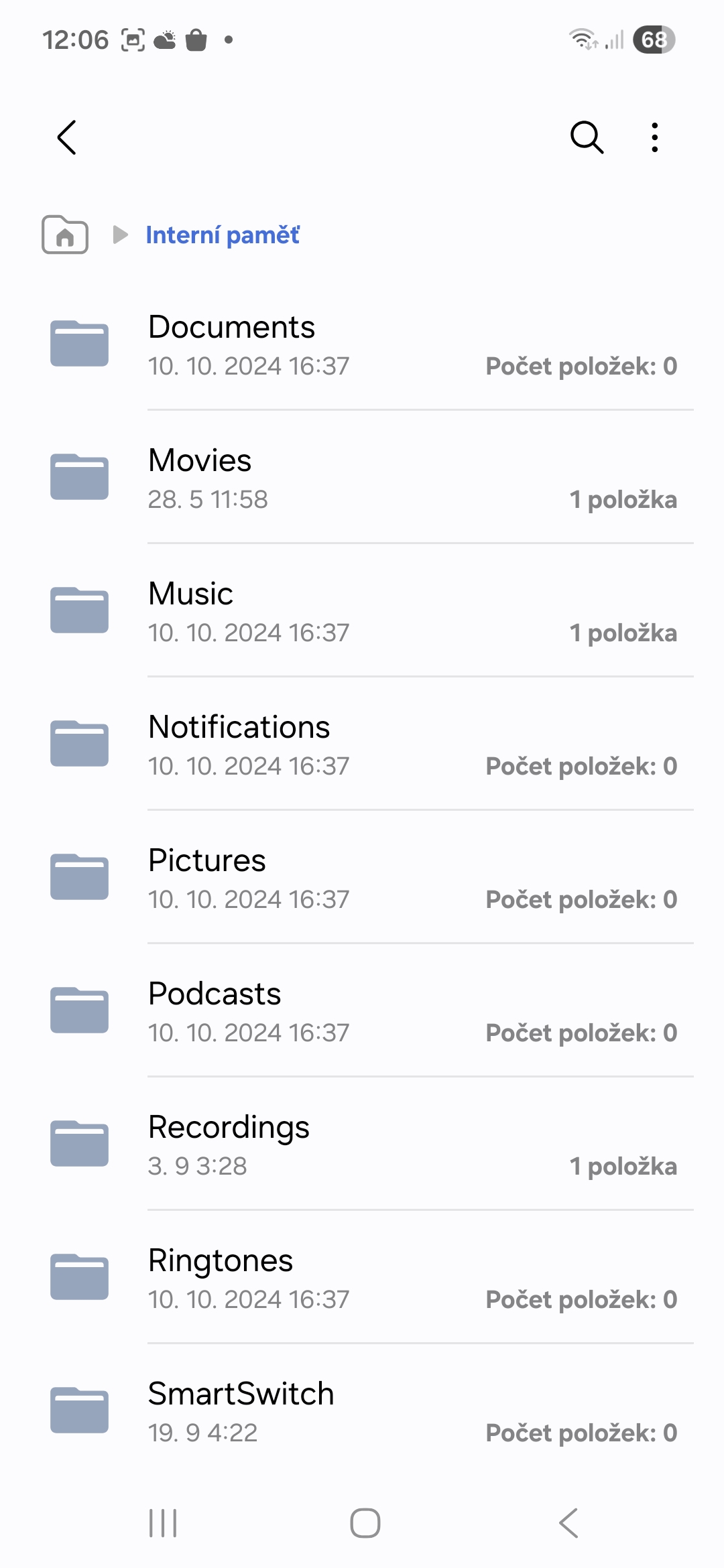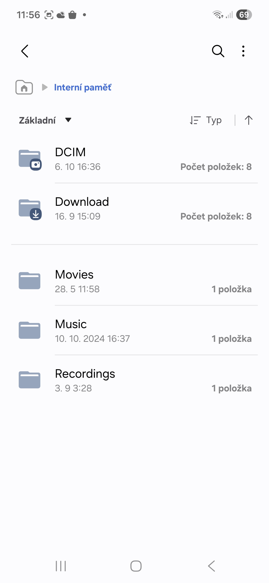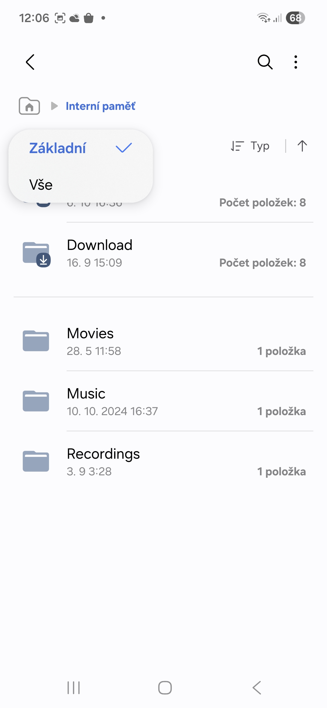 - Při přístupu k internímu úložišti se zobrazí pouze složky základní složky, mezi které patří DCIM (sem zařízení ukládá pořízené fotky/videa či snímky obrazovky), Download (stažené), Movies (filmy), Music (hudba) a Recordings (nahrávky). Pokud chcete zobrazit všechny složky, klepněte vlevo nahoře na rozbalovací nabídku a místo „Základní“ vyberte možnost Vše.